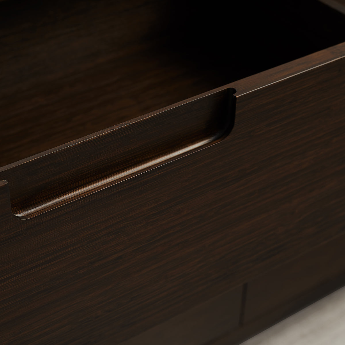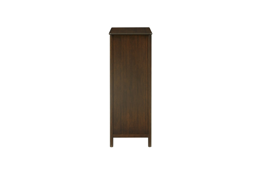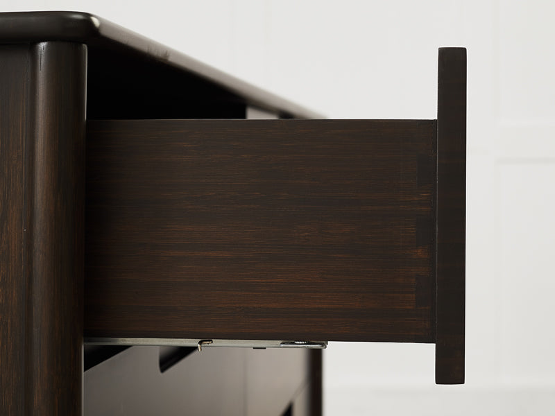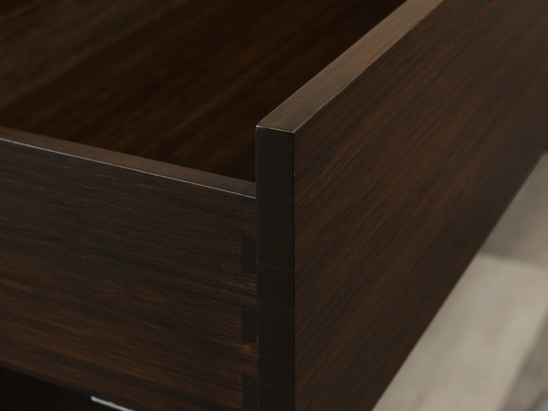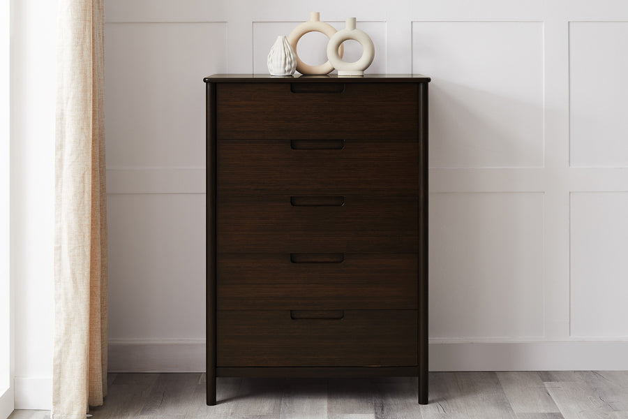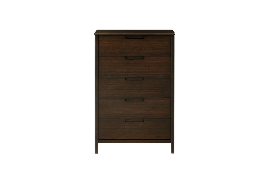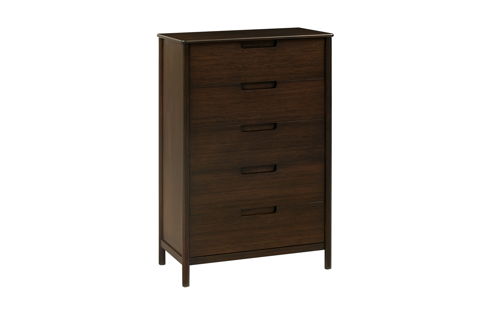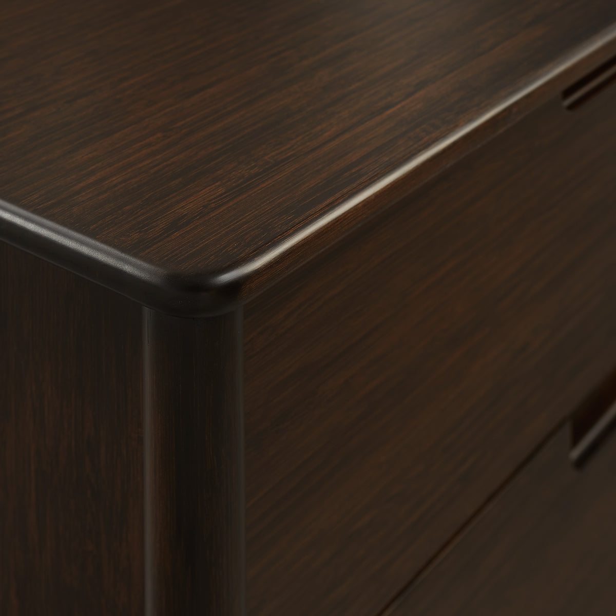 The Weston high chest combines mid-century modern elegance with the natural beauty of bamboo, offering a design that lets the bamboo grain stand out in a refined and simple way. Its versatile style, featuring curved corners, round legs, and recessed pulls, creates a light and inviting feel, making it a seamless addition to any bedroom. The high chest includes five spacious drawers, each crafted from solid bamboo and finished inside and out. The drawers are built using English dovetail joinery and equipped with soft-closing under-mount drawer glides for smooth, effortless operation. Sustainably crafted from solid bamboo and finished in a rich Black Walnut, the Weston high chest showcases the inherent variation in grain and color that adds to its natural beauty, making each piece truly one-of-a-kind. These slight differences in shade are an indication of the craftsmanship and the use of solid bamboo. Variation in grain and color enhances the inherent beauty of bamboo furniture, ensuring that each piece is truly unique. These natural differences in bamboo shading are a testament to its solid bamboo construction, reflecting the craftsmanship and quality that set a benchmark in fine furniture. By choosing Weston, you're investing in furniture that helps promote environmental sustainability while offering lasting beauty and quality. Discover the expert craftsmanship packed into each piece of Greenington bamboo furniture. Made using an earth friendly, renewable resource harvested from fully sustainable and rapidly growing forests.