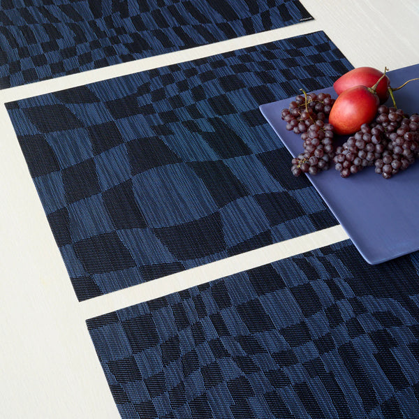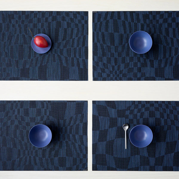 The geometry, symmetry, and contrast of a checkboard pattern is playfully softened in Warp. Squares break free of the grid, stretching and bending to form rows of undulating organic lines in natural tones. The Chilewich design team developed this weave to have an especially large scale, ensuring that each placemat is unique. Suitable for indoor and outdoor use. Made in the USA with TerraStrand® and Microban®. Free of phthalates.