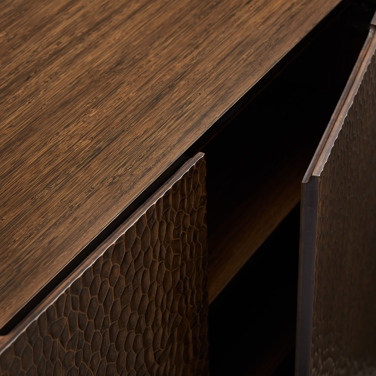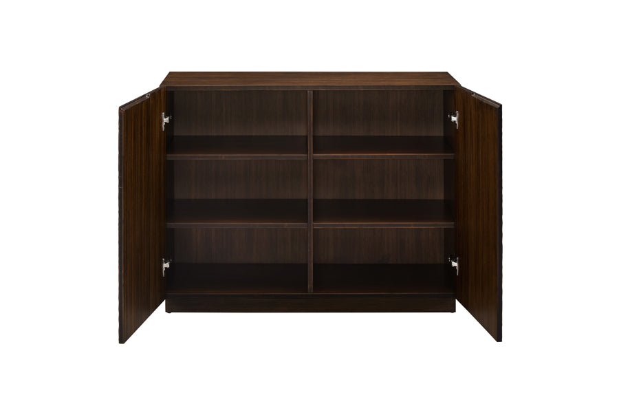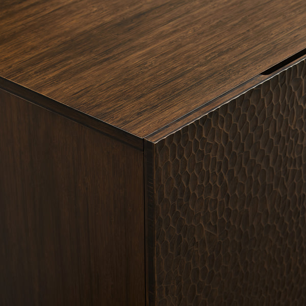 The Avalon cabinet seamlessly blends sophisticated design with practical functionality, featuring a striking 3D-textured facade that adds depth and visual interest. Beyond its aesthetic appeal, Avalon offers ample storage with six spacious compartments, making it both stylish and highly functional. Its modular design provides exceptional versatilityβexpand with additional units to accommodate a larger dining space, or utilize it as a refined sideboard, credenza, or media console to maintain a well-organized and elegant interior. Thoughtful design elements, including recessed pulls and soft-closing doors, further enhance its modern appeal. Finished on all four sides, Avalon effortlessly transitions into various roles, from a sideboard to a sleek media console, complementing contemporary interiors with ease. Expertly crafted from solid bamboo in a rich Black Walnut finish, its natural grain variations contribute to the organic beauty of each piece, ensuring a unique, one-of-a-kind aesthetic. These subtle differences in bamboo tones reflect the meticulous craftsmanship and quality of the material. Sustainably made from bamboo, a rapidly renewable and eco-friendly resource, Avalon is produced in an ISO 14001-certified facility, supporting responsible forestry practices and environmental stewardship. This commitment to sustainability ensures that each purchase contributes to the preservation of natural ecosystems.
