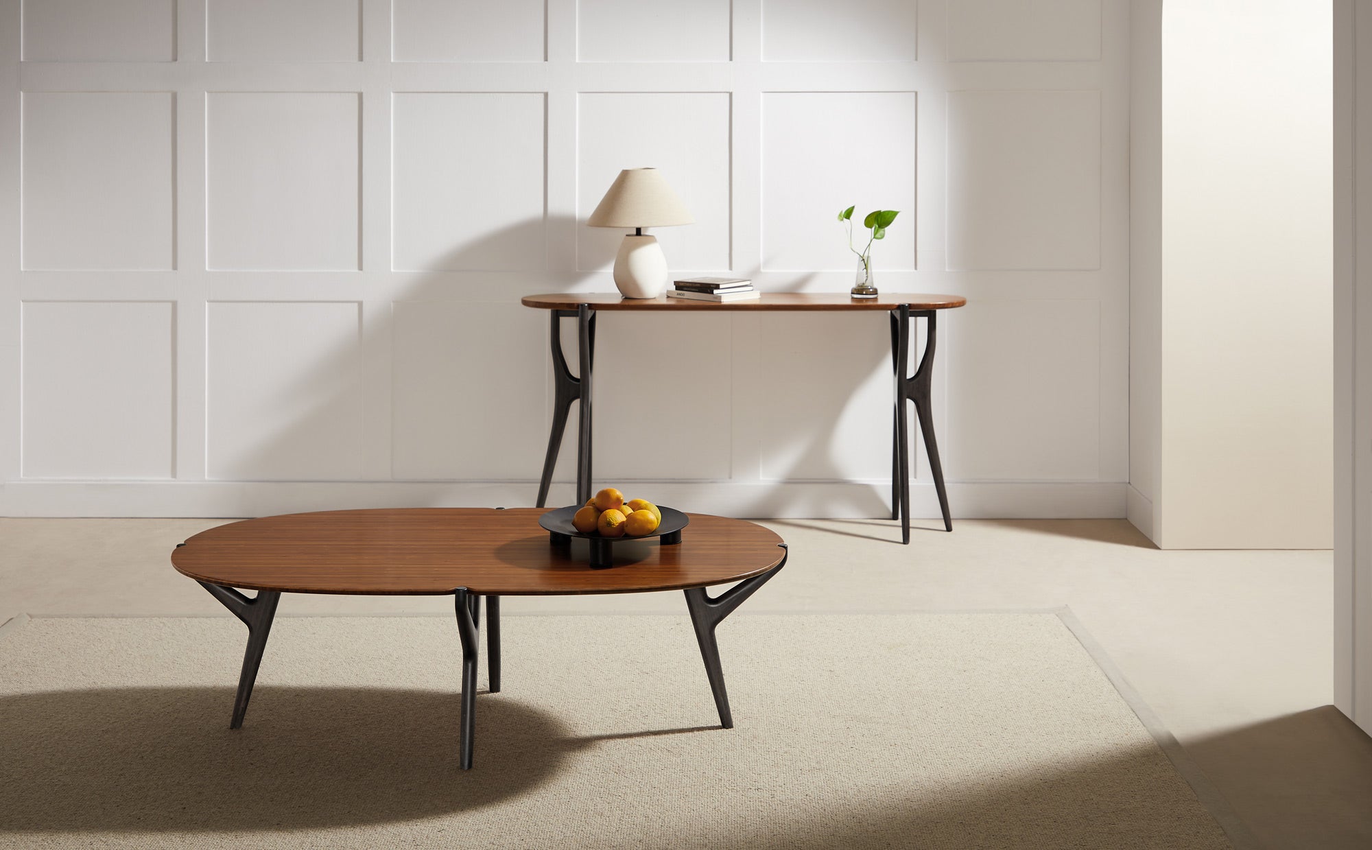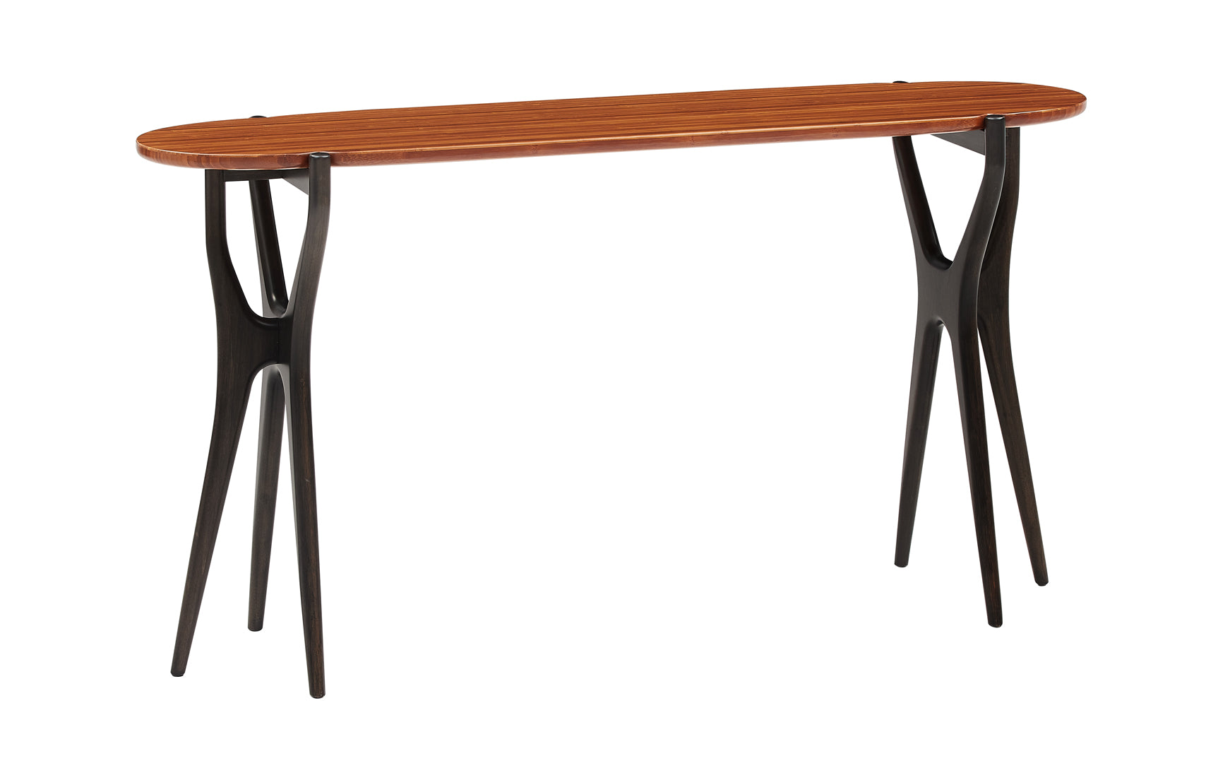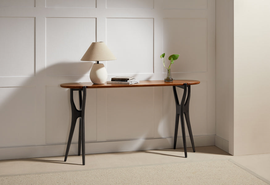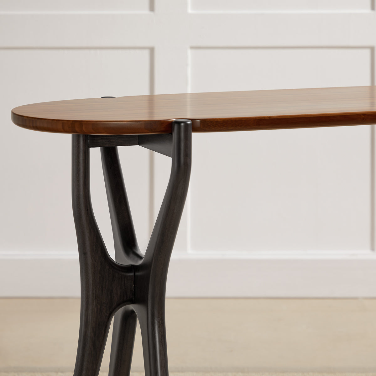 The Tofino console table stands out with its distinctive design inspired by the beauty of nature. Its freeform base, reminiscent of intertwining vines or tree roots, features elegantly inset legs finished in deep Caviar. Supporting an oblong Amber tabletop, the Tofino console seamlessly combines organic inspiration with modern sophistication, embodying true creative expression. Expertly crafted from solid bamboo, the tabletop’s rich Amber color is achieved through an eco-friendly process using heat, steam, and pressure, resulting in a vibrant hue that runs consistently through the material. Each piece highlights bamboo’s natural grain and texture, with subtle variations in shade that enhance its unique character and reflect the quality of sustainable craftsmanship. Bamboo, a rapidly renewable and environmentally conscious material, ensures the Tofino console is as sustainable as it is stylish. By choosing Tofino, you bring timeless elegance and environmental responsibility into your home while celebrating the artistry of expertly crafted bamboo furniture.