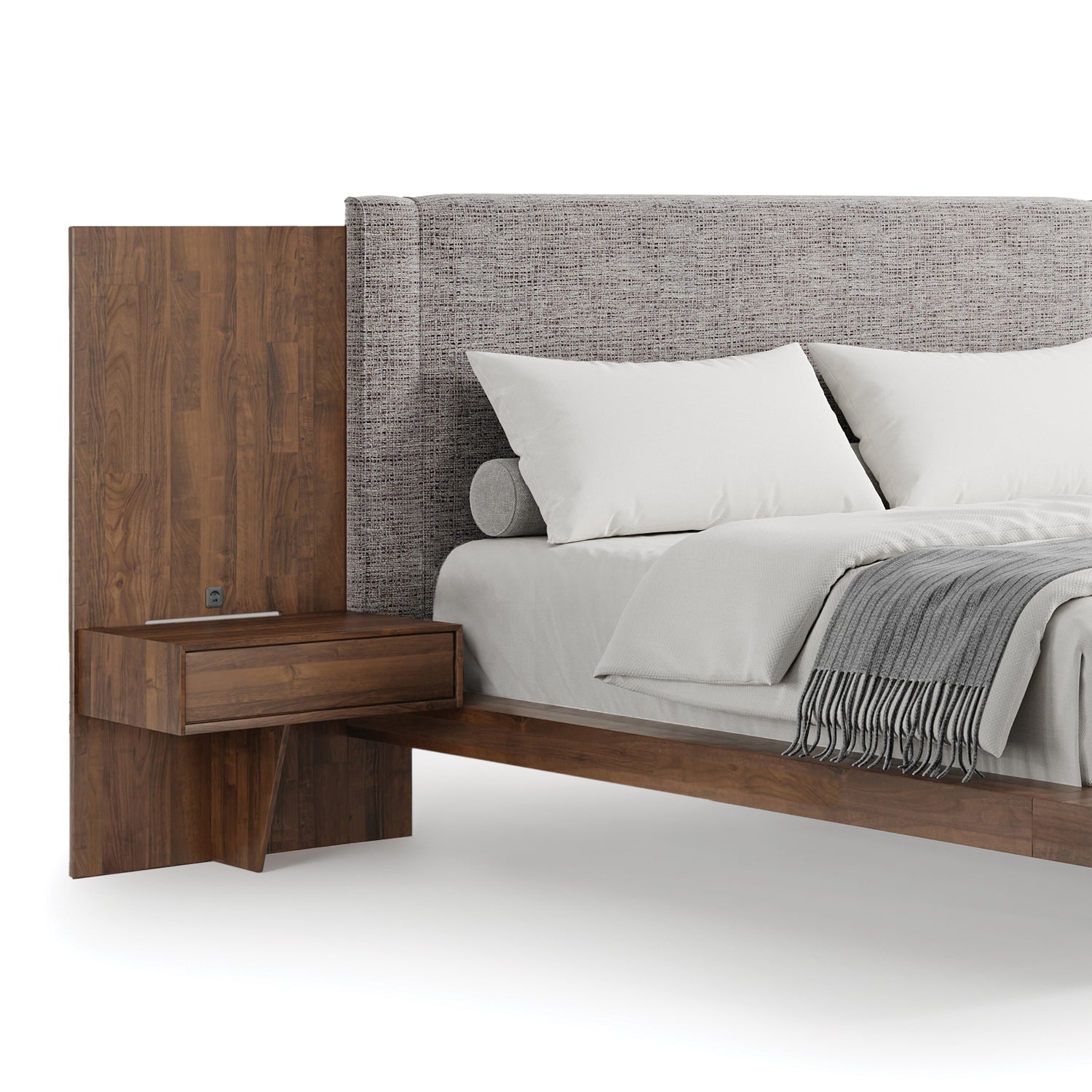 Crafted in solid American finger jointed black walnut with natural finish the Savoy Bed is offered in a range of microsuede, fabric, Ultrasuedeยฎ, Ultraleatherยฎ as well as COM (customers own material). The Savoy Bed is shown here in STERLING (M10245) upholstery. All finishes are GREENGUARD Certified for low chemical emissions.