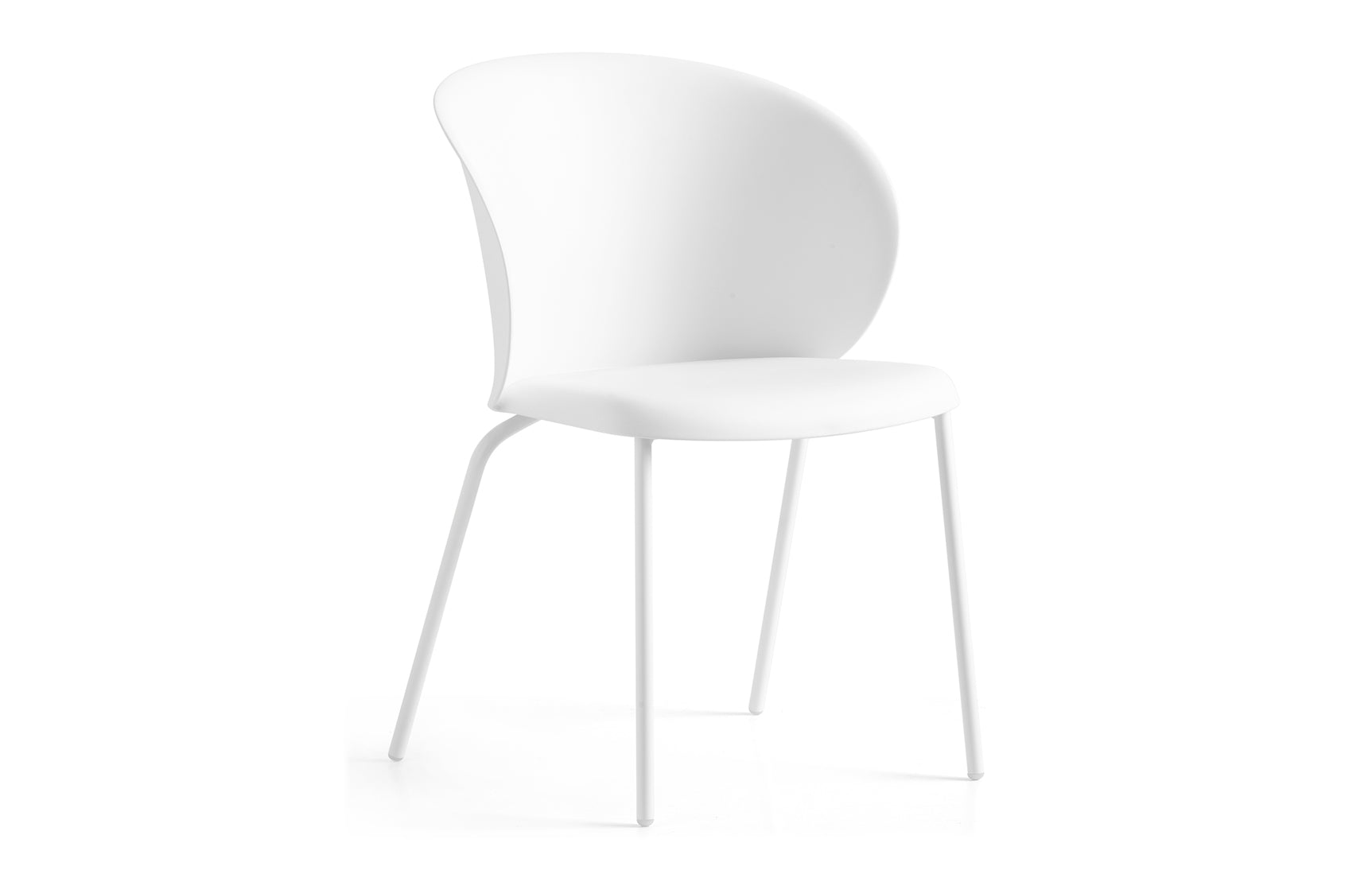 TUKA armchair with four-legged metal base. Stackable version with 100% recycled polypropylene shell. The shape of the seat and the embracing backrest are ideal for maximum comfort.