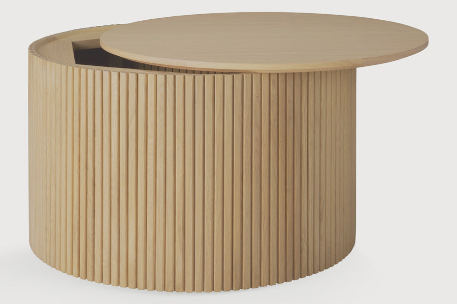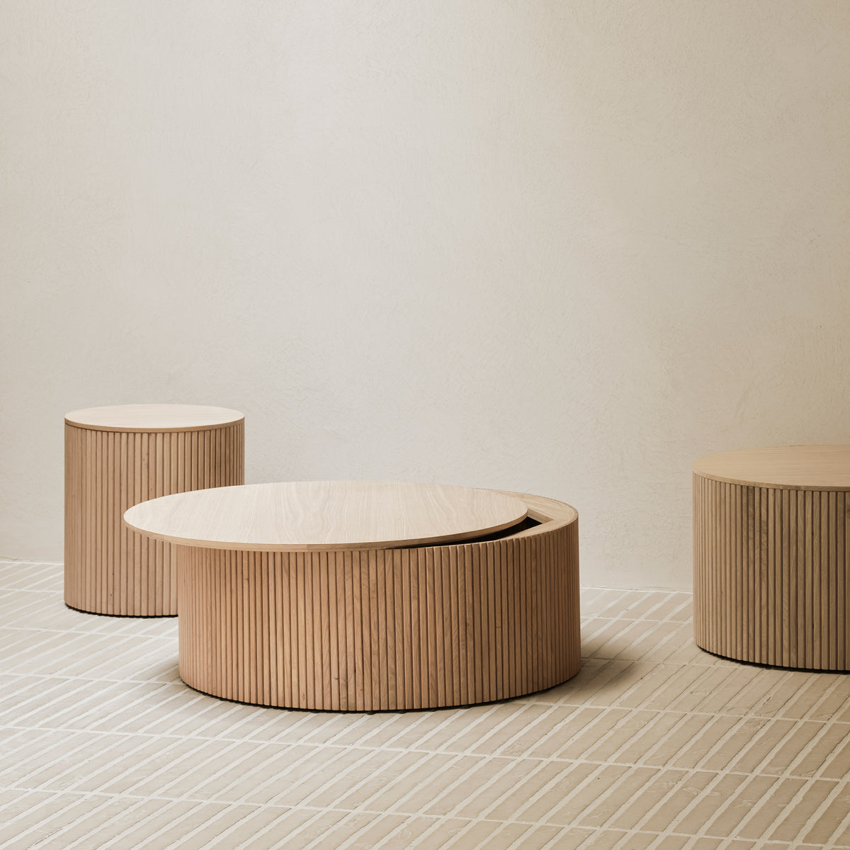 Designed by Jacques Deneef, the Roller Max is a clever multifunctional item that combines a coffee table with storage. Encapsulated in its stacked wood-stick effect, the tabletop can be easily removed to hide the newspapers, toys, cushions and throws from daily life. The perfect solution for smaller living.