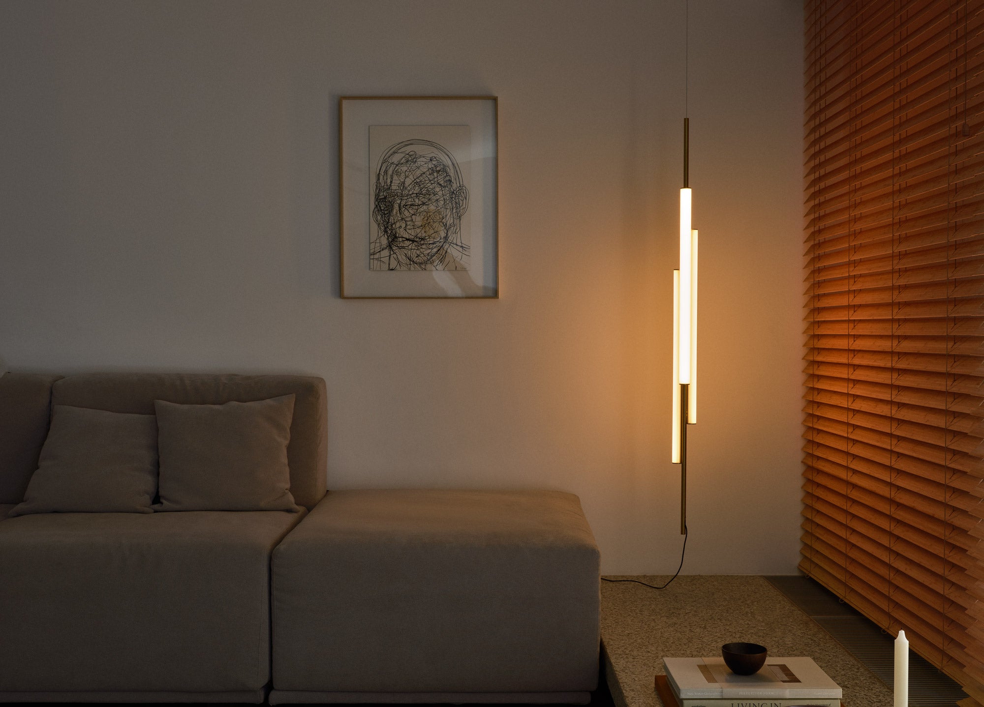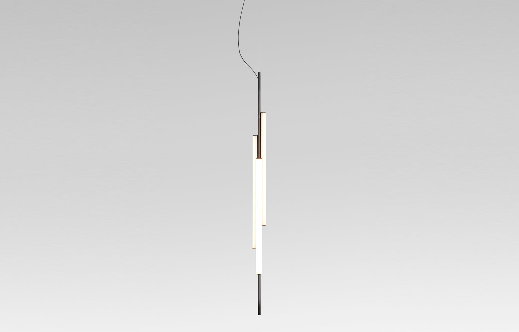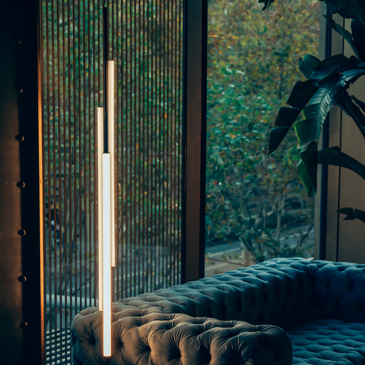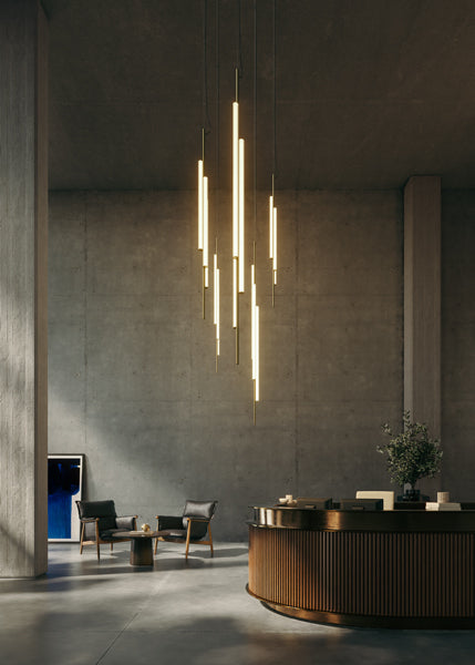 Ambrosia is essentially a line of light that can be converted into a modular system, capable of extending the illumination it offers to adapt to any space. A design that recovers and revisits the tube light, timeless, and updates it so that its simple structure and diffuse lighting add beauty to any space. This collection expands on its possibilities by proposing a change in the plane of light, from horizontal to vertical. This new style of lamp is available in two versions, both of which are pendant lamps. First there is the Ambrosia V2, a 92,52 inches high vertical structure consisting of two tubes of light of different lengths. An interrupted line of light, a detail that brings lightness and character to the lamp. Its design allows you to choose the lighting, either towards the wall for indirect light, or towards the main space for direct light. This aesthetic and functional design also works well in domestic settings. The other vertical version, Ambrosia V3, joins three light tubes placed at different heights, forming a sculptural ensemble. This option can provide a great deal of light and therefore comes with a dimming system for easy lighting control. It is available in two heights of 51,18 inches and 68,89 inches. Both sizes can be electrically connected through the ceiling rosette or the floor plug. The new Ambrosia allows you to create vertical lighting compositions, combining different sizes in repetition to illuminate large spaces. When installed individually, it fills the space with light and warmth. Its slender design sets the perfect scene in any room. A totally new perspective for this flexible lighting system, which achieves maximum light expression with a minimalist structure. The metal structure is available in two finishes – black and matte gold – and the light source in three colour temperatures: 2200 K, 2700 K and 3000 K.