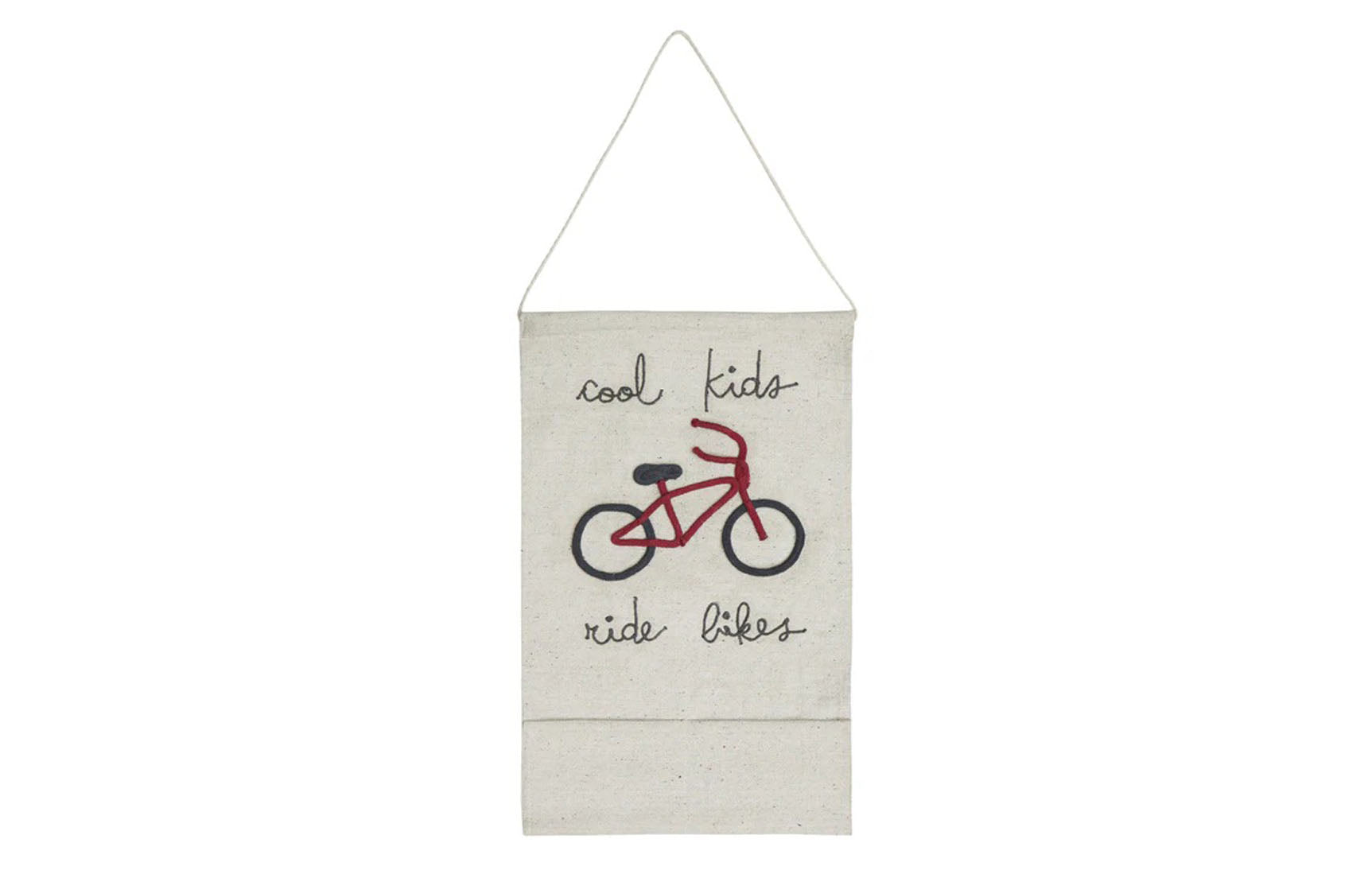 The Eco-City is where cool kids ride bikes, as shown by the embroidered lettering on this practical wall pocket hanger. Perfect for storing small toys, books, crayons, bricks, or even little house slippers!