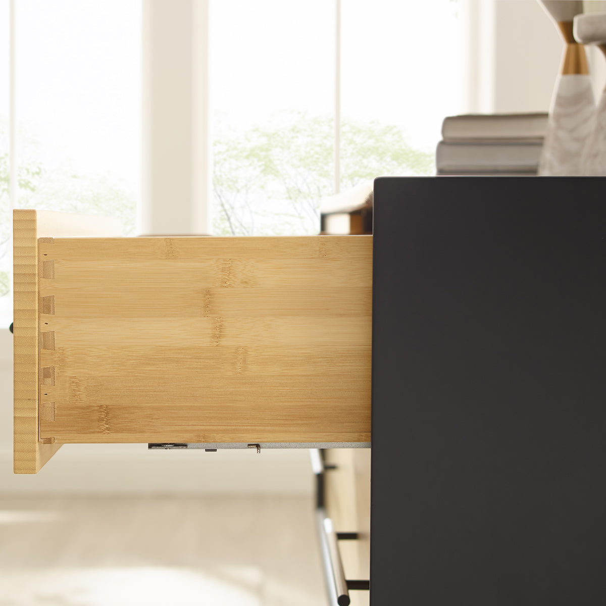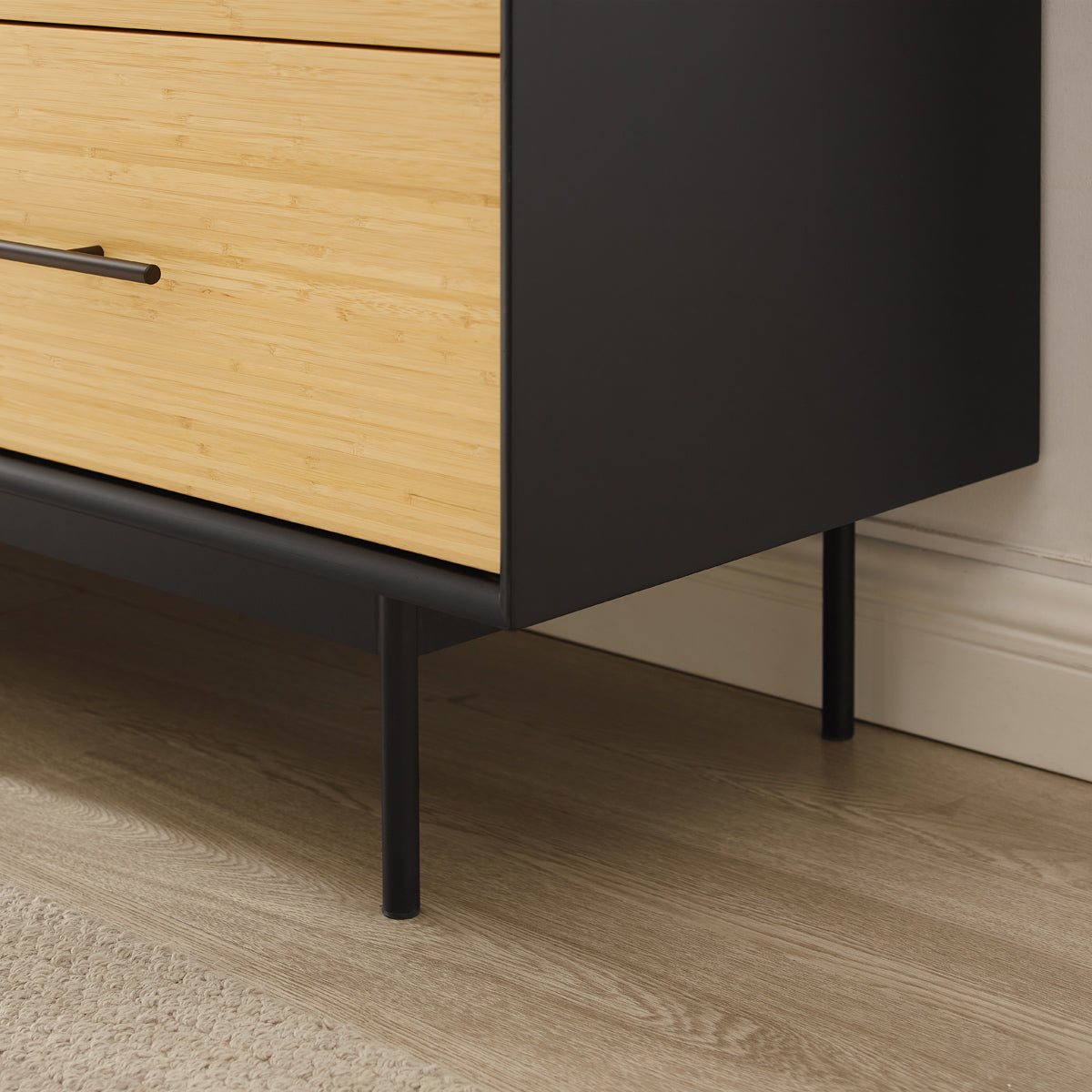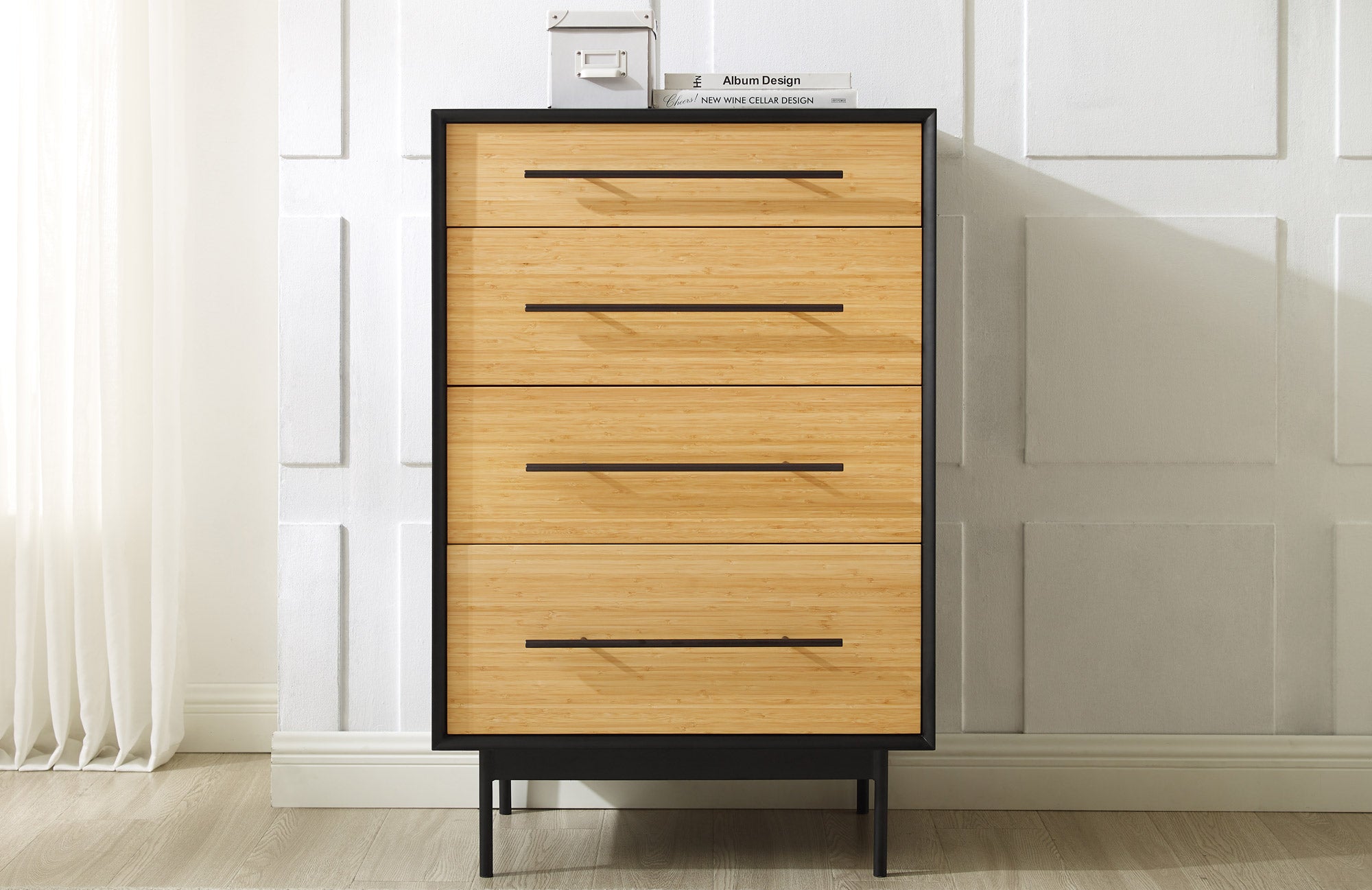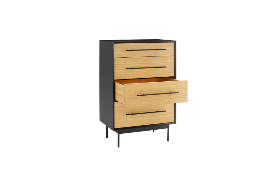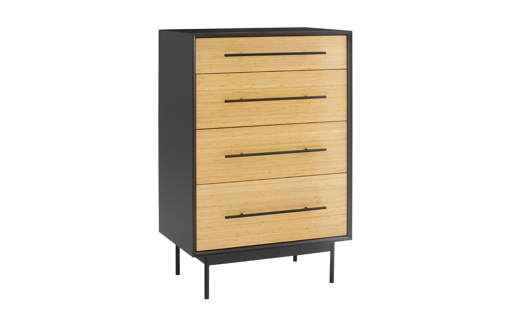 Create a casual and sophisticated look with Greenington’s Santa Cruz high chest. The sleek modern design and simple clean lines of the four drawer Santa Cruz high chest features a craftsman-built frame made from solid bamboo, lacquered in a matte black finish on a strong steel base. Black steel accents complement Wheat bamboo drawers and black lacquer surfaces. Four wide solid bamboo drawers are built using English dovetail joinery and uses under-mounted, soft-close glides for easy opening and closing. Each drawer is faced in Wheat solid bamboo material, with a drawer box of warm caramelized solid bamboo, and accented with a slim black steel drawer pull. Environmentally safe, Wheat is not a surface stain, the color is the result of an innovative caramelization process using heat, steam, and pressure to transform the solid bamboo material into Wheat’s light color. Each Santa Cruz chest is beautifully finished on all four sides and ships professionally assembled. Discover the expert craftsmanship packed into each piece of Greenington bamboo furniture, made using a renewable resource harvested from fully sustainable and rapidly growing forests.