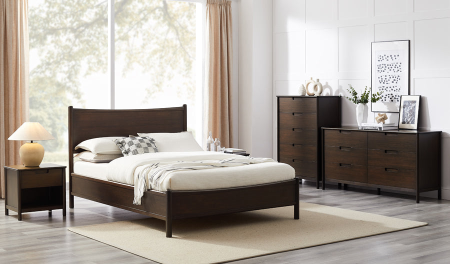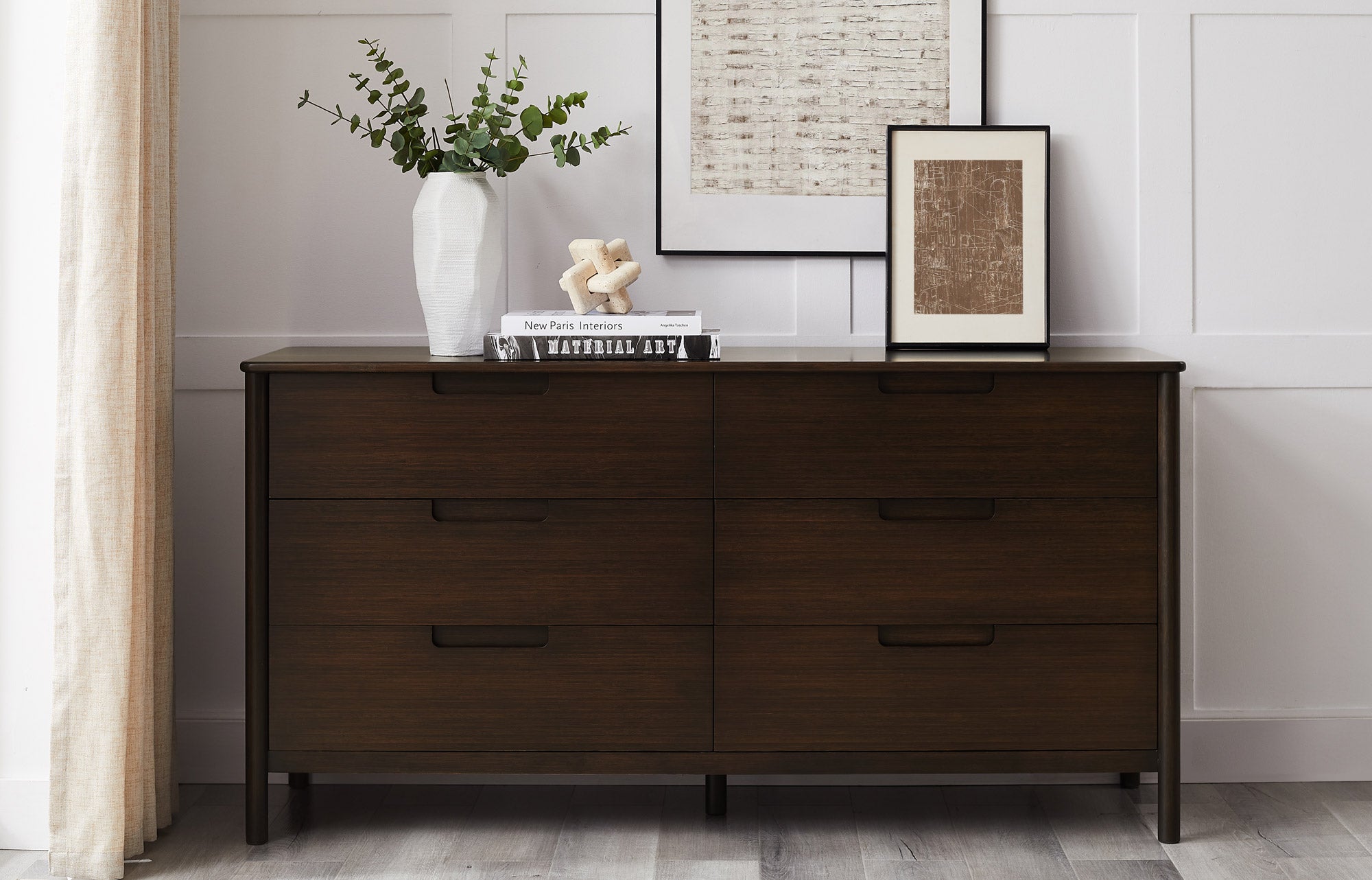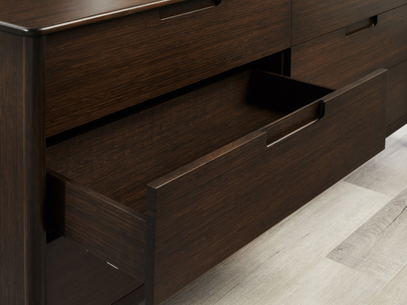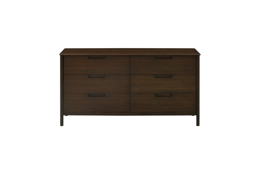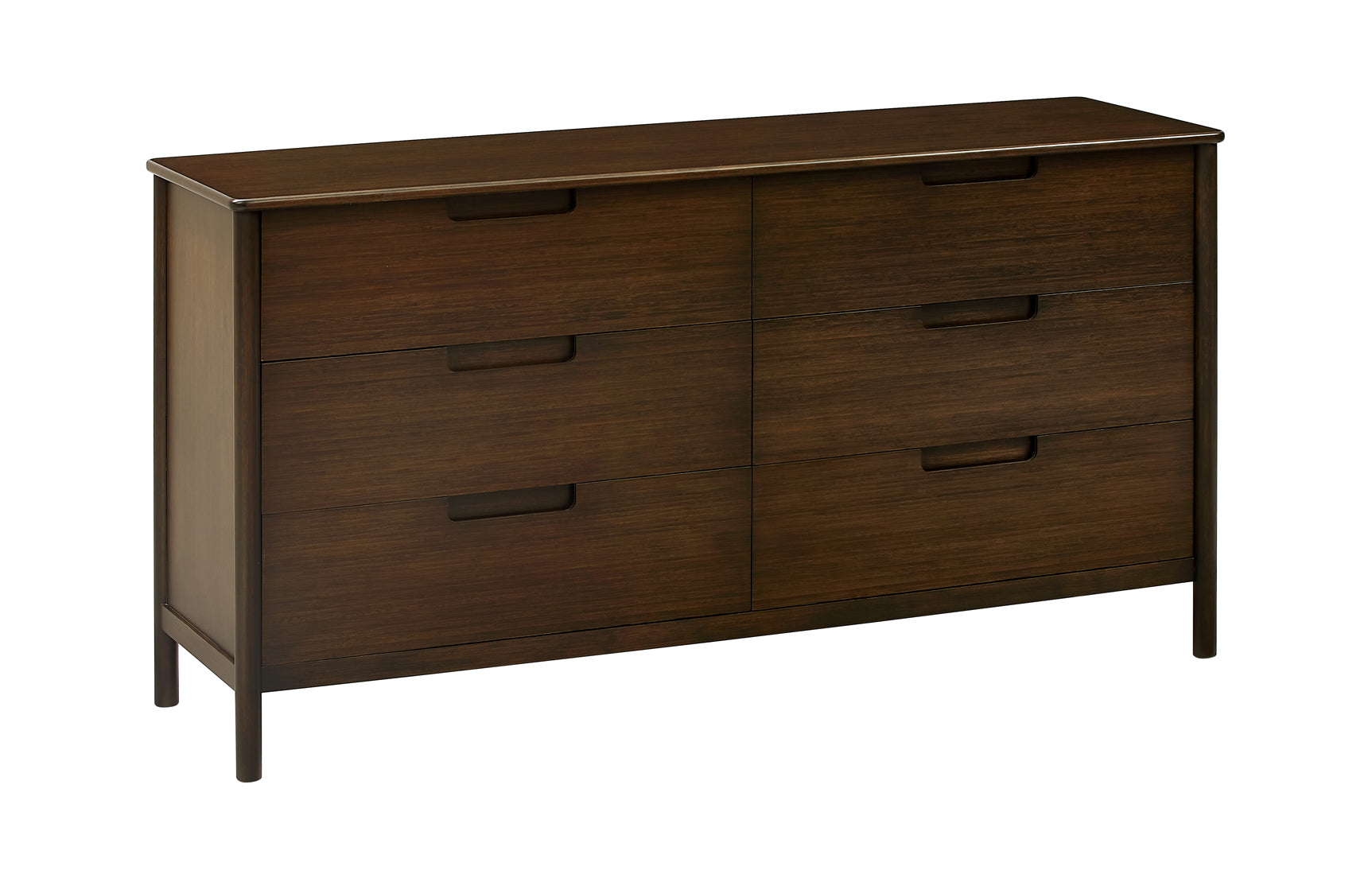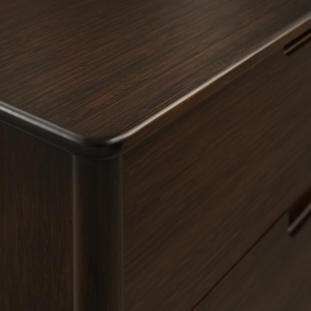 The Weston dresser brings mid-century modern charm to your bedroom, combining timeless simplicity with exceptional craftsmanship. Its clean design highlights the natural beauty of bamboo grain, while curved corners, round legs, and recessed pulls add a touch of elegance. The dresser offers six generously sized drawers, providing ample storage for your essentials. Each drawer is finished inside and out, constructed with sturdy English dovetail joinery, and features soft-closing, under-mount glides for smooth and quiet operation. Expertly crafted from sustainable solid bamboo, the Weston dresser is finished in a rich Black Walnut tone, showcasing the unique grain and color variations that make each piece truly one of a kind. These natural differences are a hallmark of high-quality bamboo furniture and reflect its authenticity and artistry. By choosing Weston, you're investing in furniture that helps promote environmental sustainability while offering lasting beauty and quality. Discover the expert craftsmanship packed into each piece of Greenington bamboo furniture. Made using an earth friendly, renewable resource harvested from fully sustainable and rapidly growing forests.
