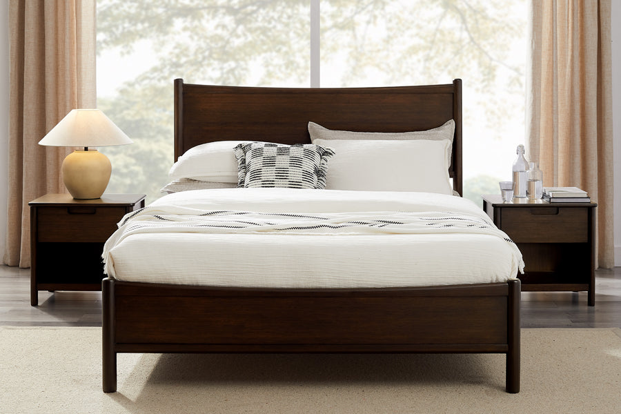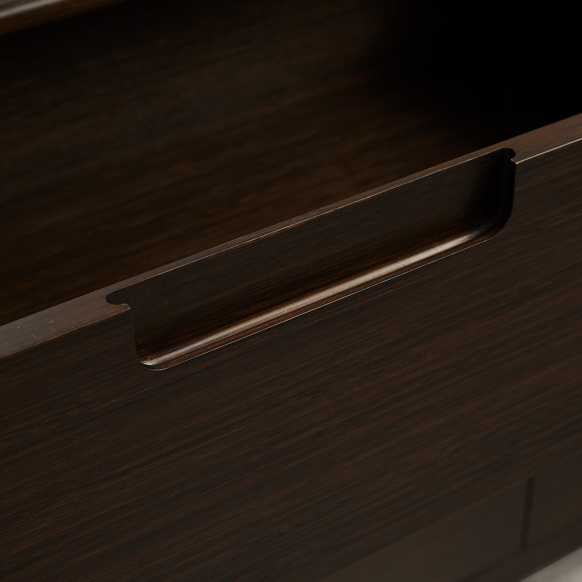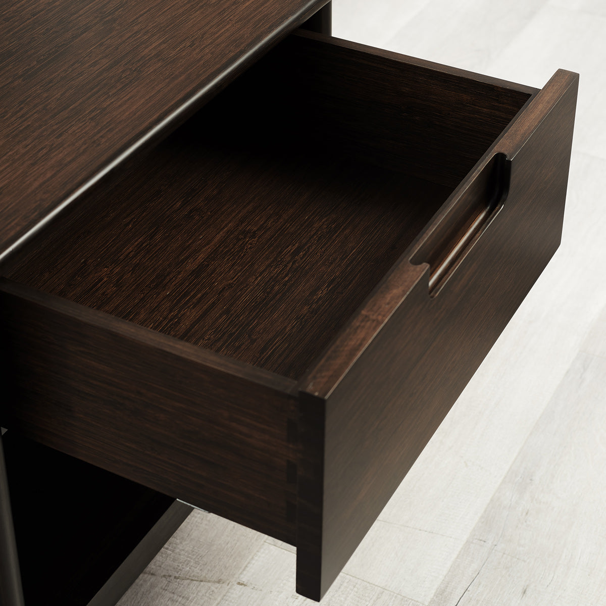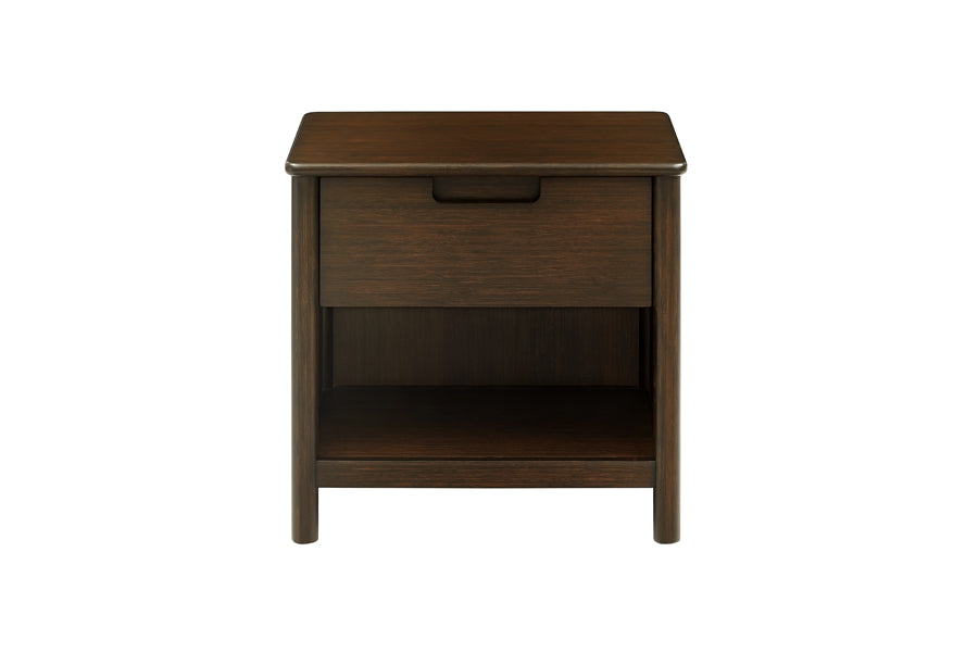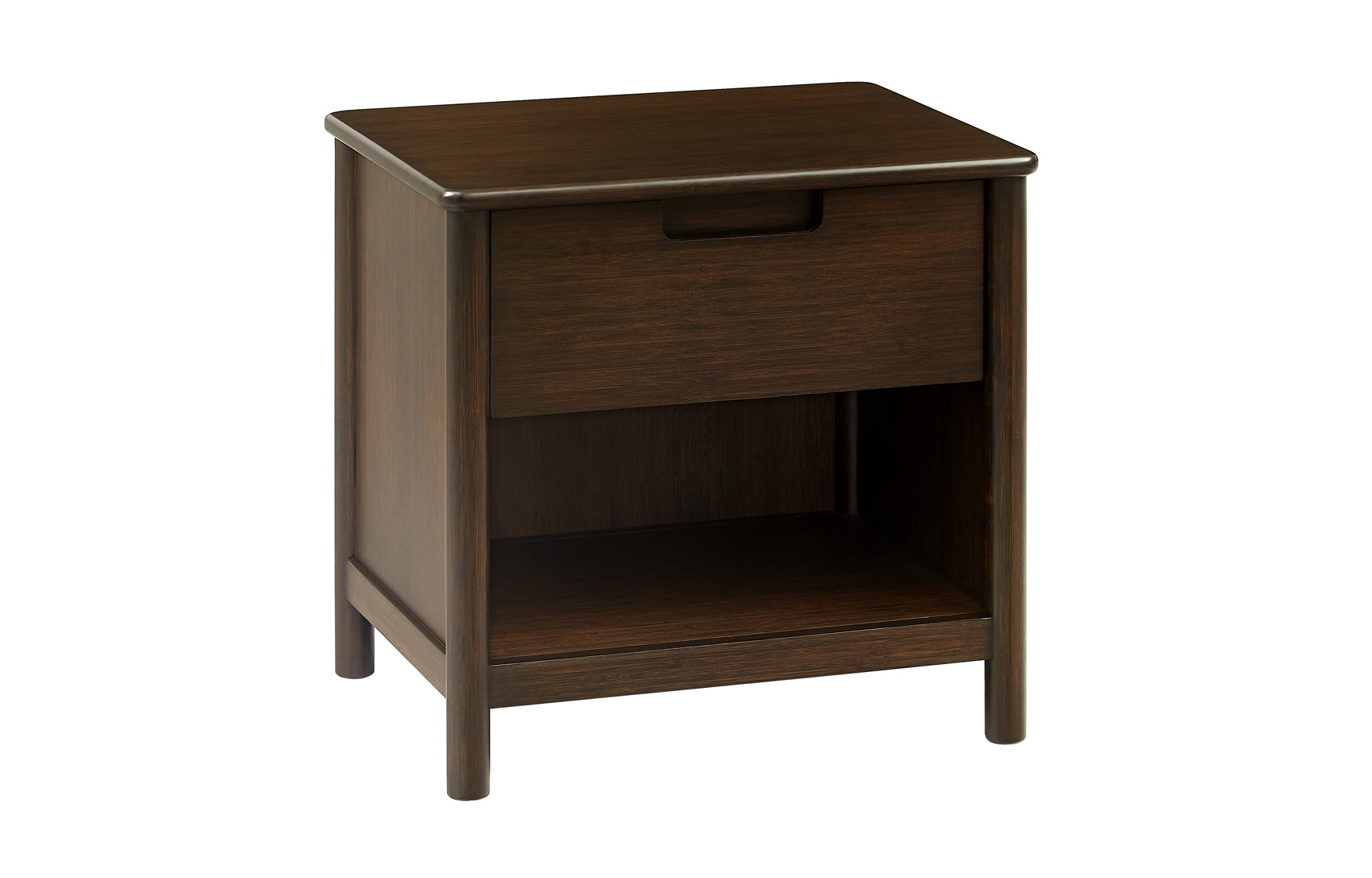 The Weston nightstand offers a mid-century modern design with simplicity at its core, allowing the bamboo grain to stand out beautifully. Its versatile style keeps the bedroom feeling light and inviting, with curved corners, round legs, and recessed pulls adding to its charm. The nightstand features both an open shelf and a storage drawer, each finished inside and out. The drawer is crafted using English dovetail joinery with soft-closing under-mount glides, ensuring smooth and quiet operation. Sustainably crafted in solid bamboo and hand finished in a rich Black Walnut, the Weston nightstand shows natural variations in grain and color, which enhance its beauty and make each piece one-of-a-kind. The slight differences in bamboo shade colors are a hallmark of solid bamboo craftsmanship and reflect the high-quality nature of the product. By choosing Weston, you're investing in furniture that helps promote environmental sustainability while offering lasting beauty and quality. Discover the expert craftsmanship packed into each piece of Greenington bamboo furniture. Made using an earth friendly, renewable resource harvested from fully sustainable and rapidly growing forests.
