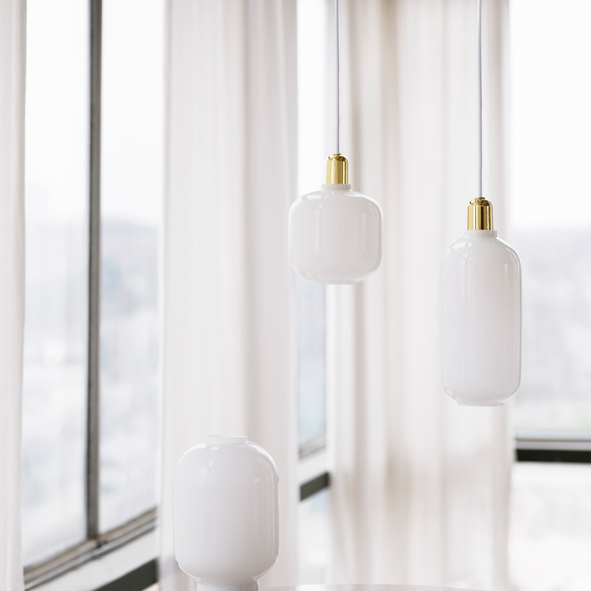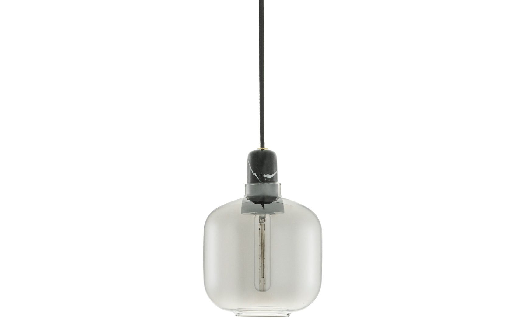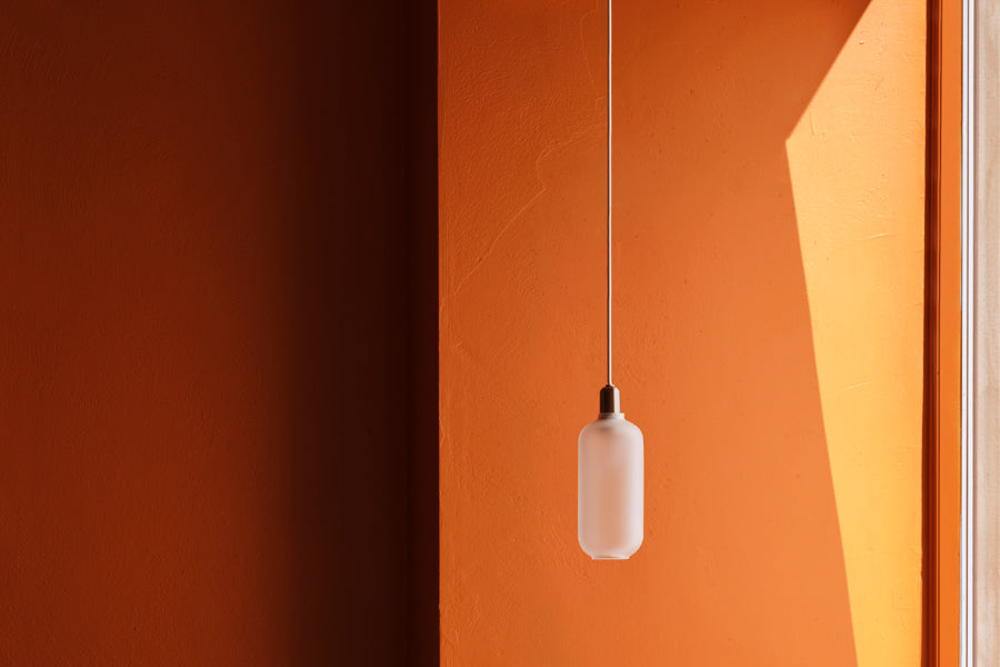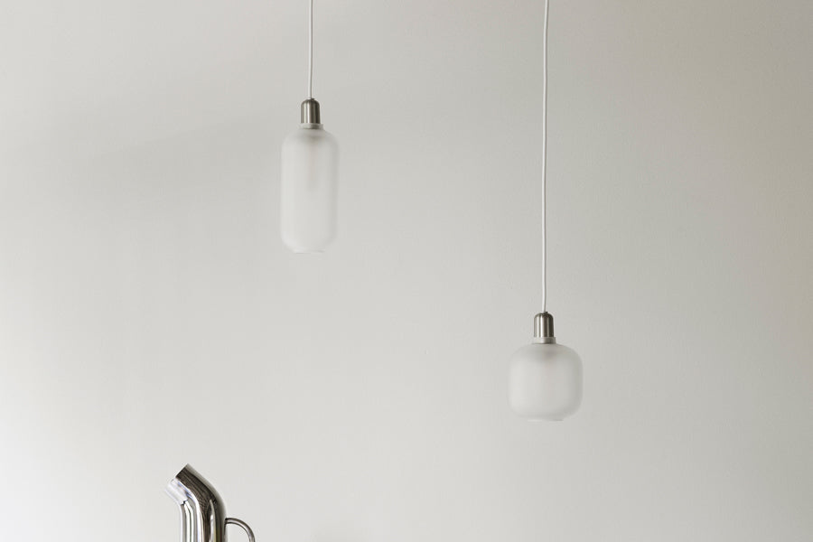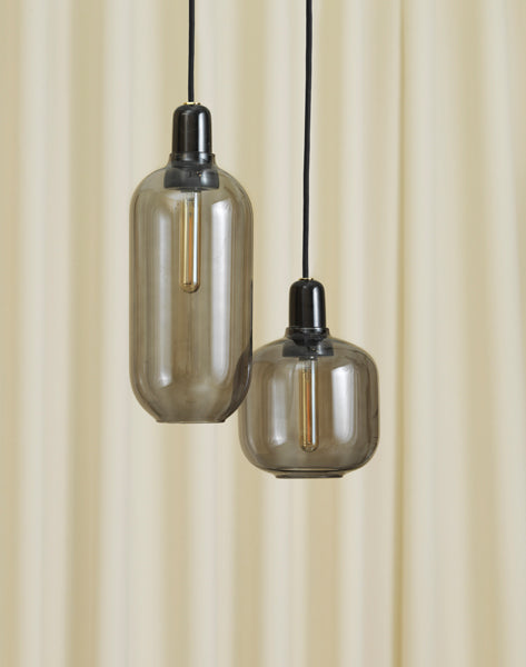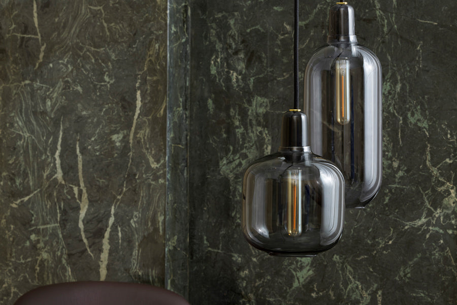 Table lamps with gold glass are provided with a 2m green textile cord with a switch. Pendants with gold glass are provided with 4m green textile cord and a black ceiling canopy. Tables lamps with smoke glass are provided with a 2m black textile cord with a switch. Pendants with smoke glass are provided with a 4m black textile cord and a black canopy. Table lamps with white glass are provided with a 2m white textile cord with a switch. Pendants with white glass are provided with 4m white textile cord and a white ceiling canopy. The Amp wall lamp comes with a canopy in powder coated metal and is delivered with a 2-meter power cord. The Amp wall lamp can be installed directly to the power outlet (hardwired) or using the included power cord. The switch is located on the base.