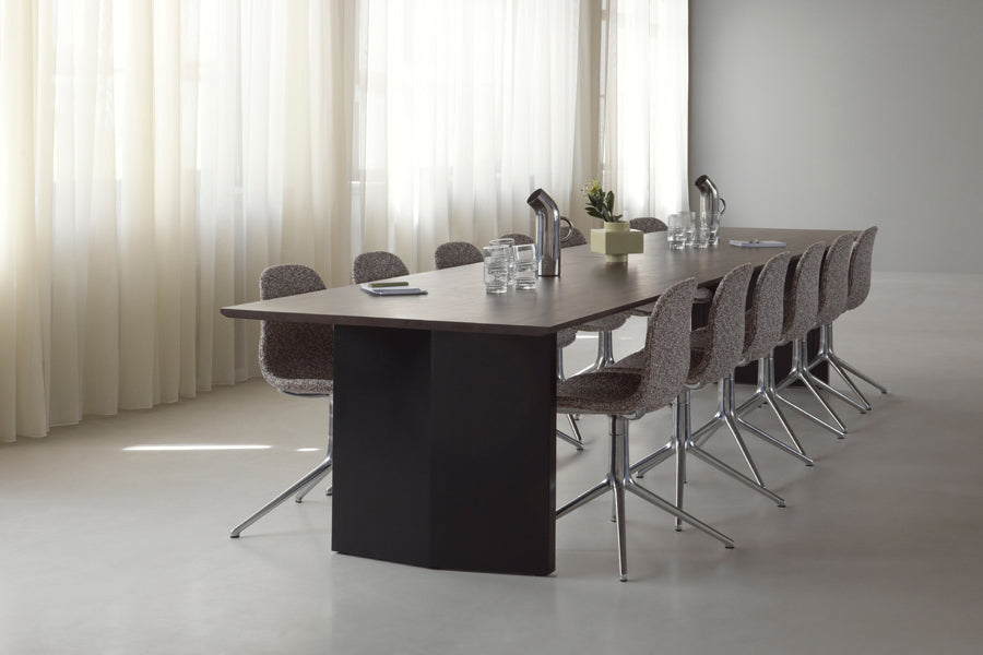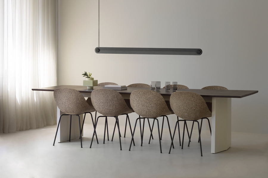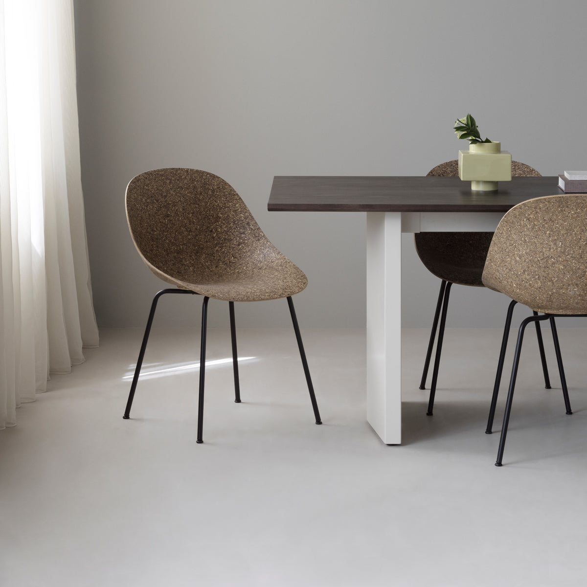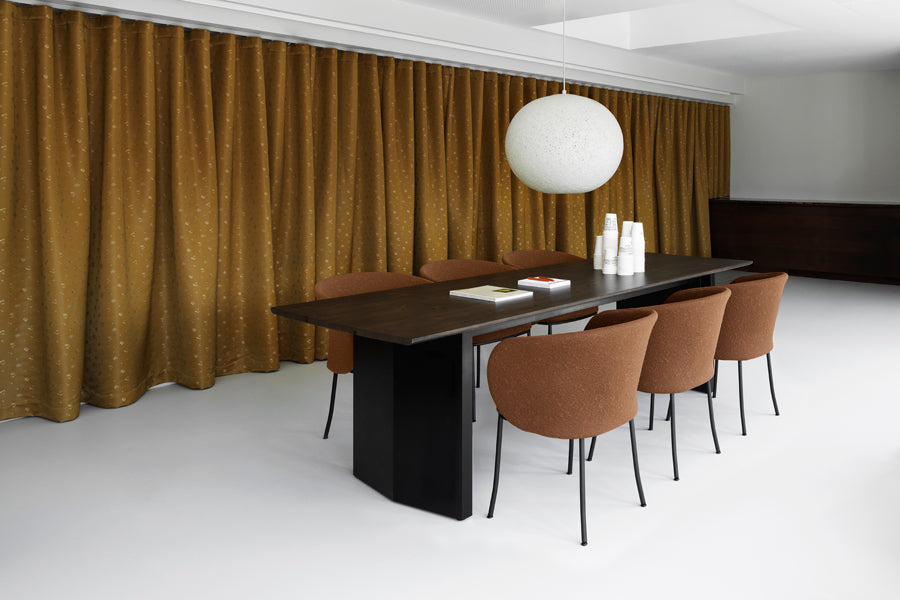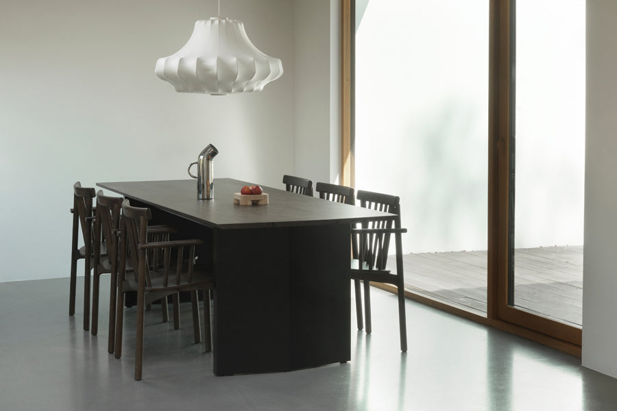 Using three visual elements reminiscent of three separate panels, Panel Table discards the archetypical notion of a dining table with four legs, once in each corner. Instead, the flat-packed design features a well-balanced, robust construction crafted using materials that offer a beautiful interplay and timeless relevance. The tabletop for Panel Table is crafted from FSC™️ certified pine (FSC-C163461) and pine from other controlled sources, finished with a Dark Brown stain and protective, matt lacquer. The tabletop rests atop two powder coated steel bases connected with a steel beam. The wooden tabletop as well as the two metal legs are cut in a slight angle, an elegant detail that infuses the design with an airy, sophisticated expression despite its innate robustness.