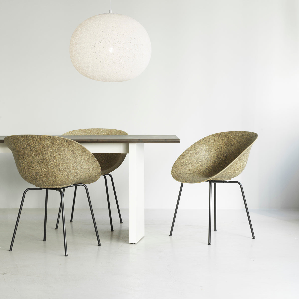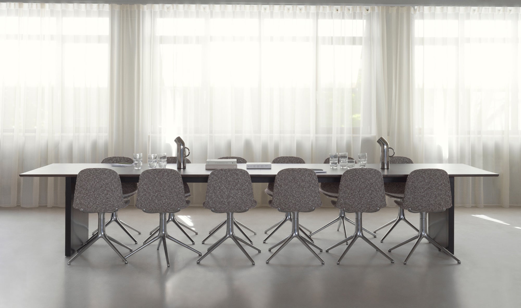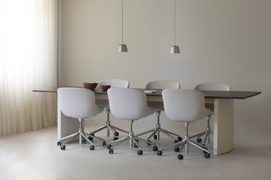 Using three visual elements reminiscent of three separate panels, Panel Table discards the archetypical notion of a dining table with four legs, once in each corner. Instead, the flat-packed design features a well-balanced, robust construction crafted using materials that offer a beautiful interplay and timeless relevance. The tabletop for Panel Table is crafted from FSC™️ certified pine (FSC-C163461) and pine from other controlled sources, finished with a Dark Brown stain and protective, matt lacquer. The tabletop rests atop two powder coated steel bases connected with a steel beam. The wooden tabletop as well as the two metal legs are cut in a slight angle, an elegant detail that infuses the design with an airy, sophisticated expression despite its innate robustness.