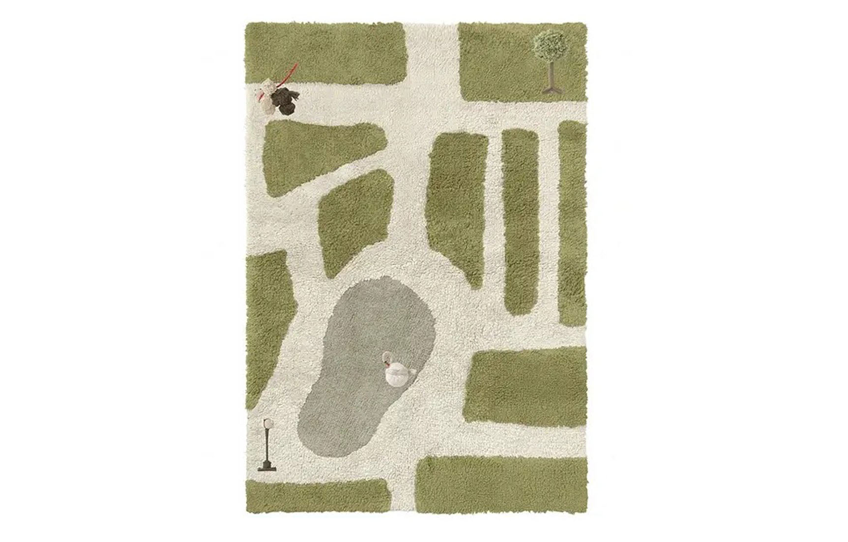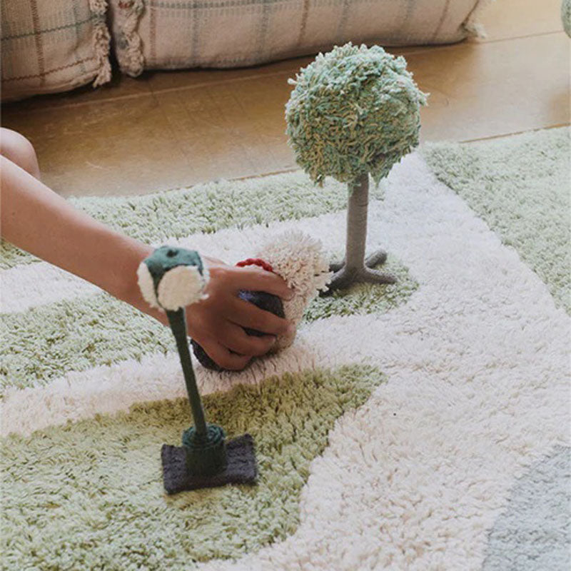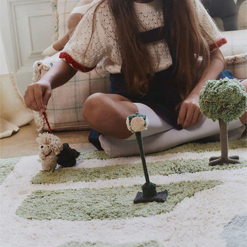 A walk through Hyde Park! Rectangular cotton play rug inspired by London’s iconic Hyde Park. Includes five handmade accessories: a tree, street lamp, bridge, dog, and swan — all stored in a practical cotton bag. Each piece is carefully made by hand using materials like cotton cords, bamboo, and hand-trimmed details to bring the park to life.
