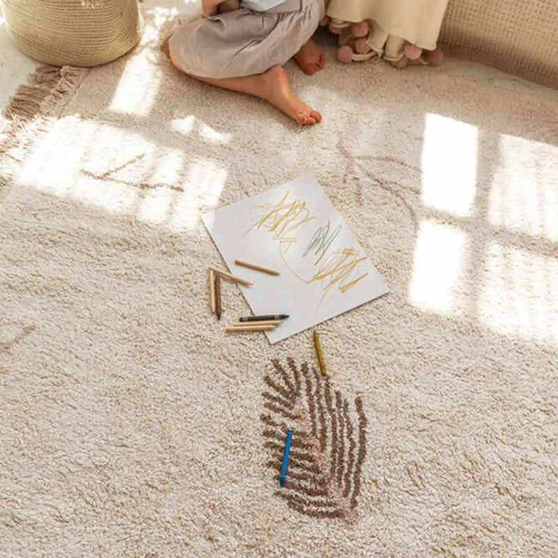 As a child, Lorena Canals remembers her walks through coastal Mediterranean forests collecting leaves, herbs, branches, pine cones and other stuff. This rug showcases these little treasures, scattered over the surface. A design inspired by nature and its neutral, natural shades that becomes a timeless piece, fit for any decor.
