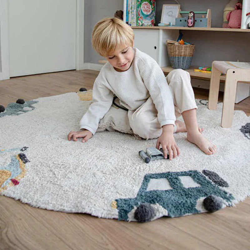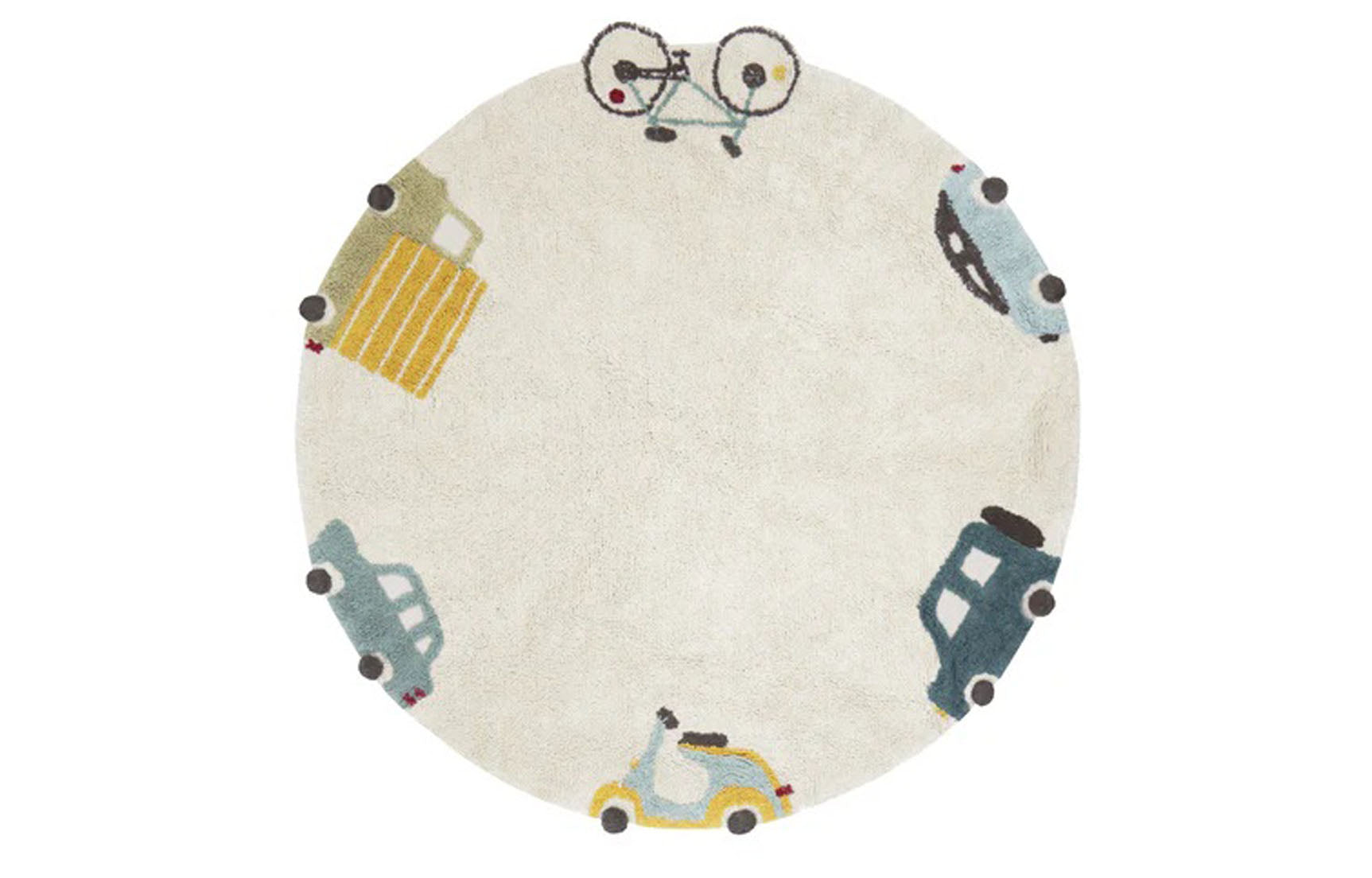 Ready for a ride around the Eco-City? Let your childβs imagination take the wheel on this soft, round washable rug, circled by e-vehicles and bikes, sporting pom-poms as wheels. It comes in a convenient size to set up play anywhere around the house. The perfect choice to decorate the kidsβ room or nursery in style, matching the Eco-City theme collection. So, whoβs in for some vroom-vroom fun?