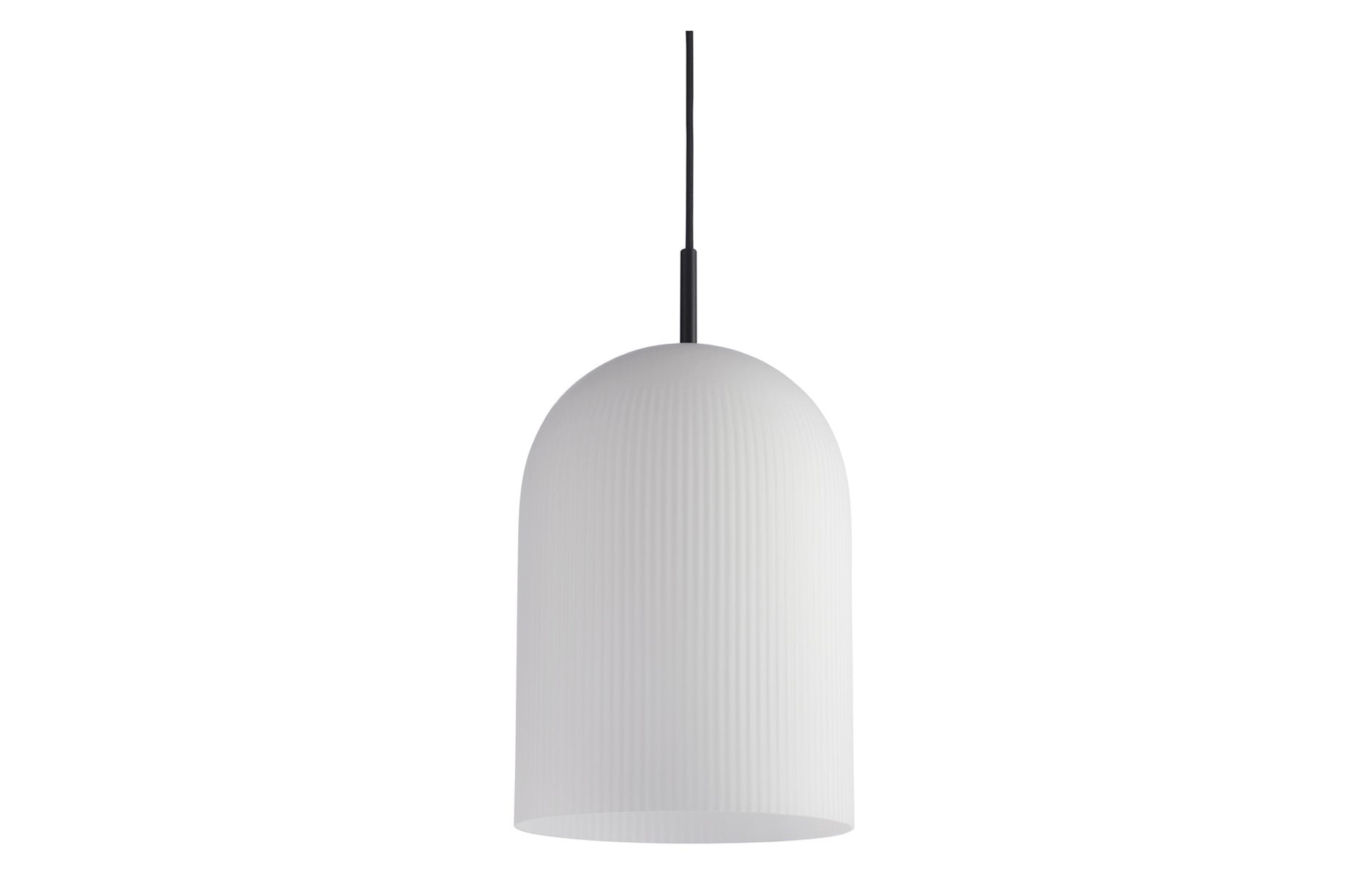 With its sculptural and minimalistic refined silhouette, the ghost pendant has a modern purity. Made of translucent opal glass, the shade gives an illusion of a white cloth thrown over the light source. Resembling the appearance of a friendly ghost in the air. A figure that is enhanced by the subtle vertical groove pattern fading out gradually upwards.