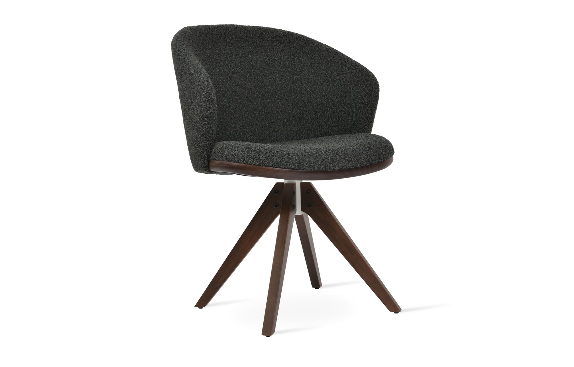 Athena Pyramid Swivel is a contemporary dining chair with a comfortable upholstered seat and backrest on swivel pyramid wood legs. The seat has a steel structure with βSβ shape springs for extra flexibility and strength. This steel frame molded by injecting polyurethane foam. Athena Pyramid Swivel may be upholstered with variety of other colors as a special order with a minimum of quantity required. The chair is suitable for residential use only. Athena Pyramid Swivel is designed by Industrial Modern Team.