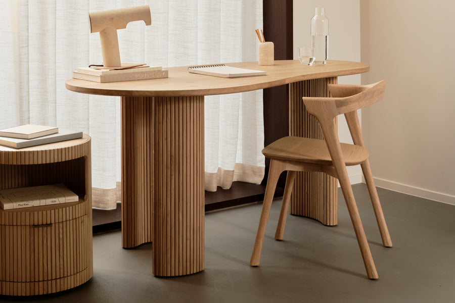 Inspired by shapes found in nature, the Boomerang collection features a playful, pebble top set on curved legs with a stacked, wood stick effect. The Boomerang desk is a statement piece for any workspace with its organic, eye-catching design unique for the office.