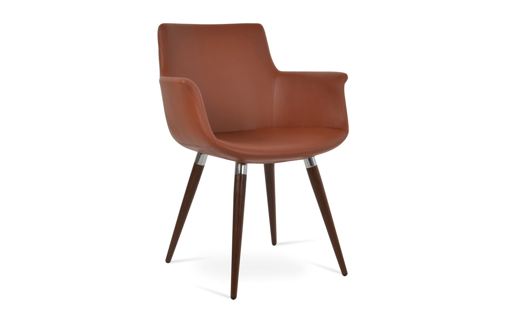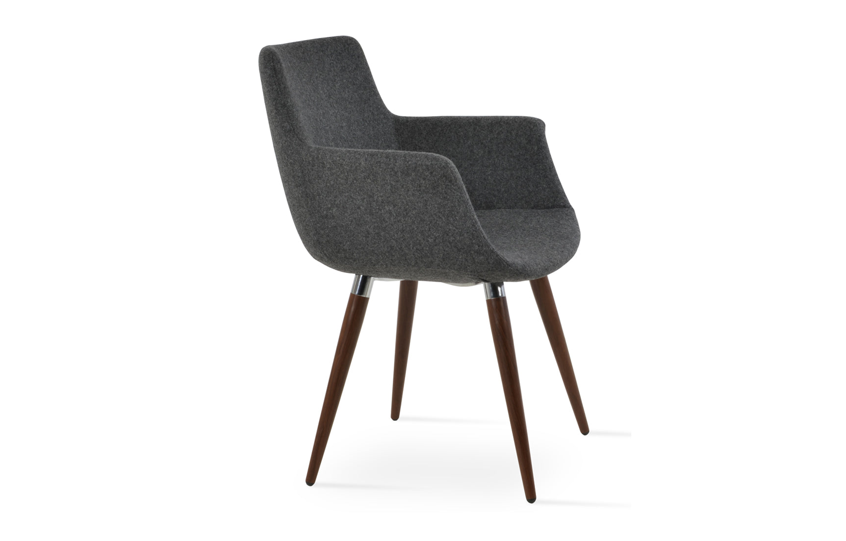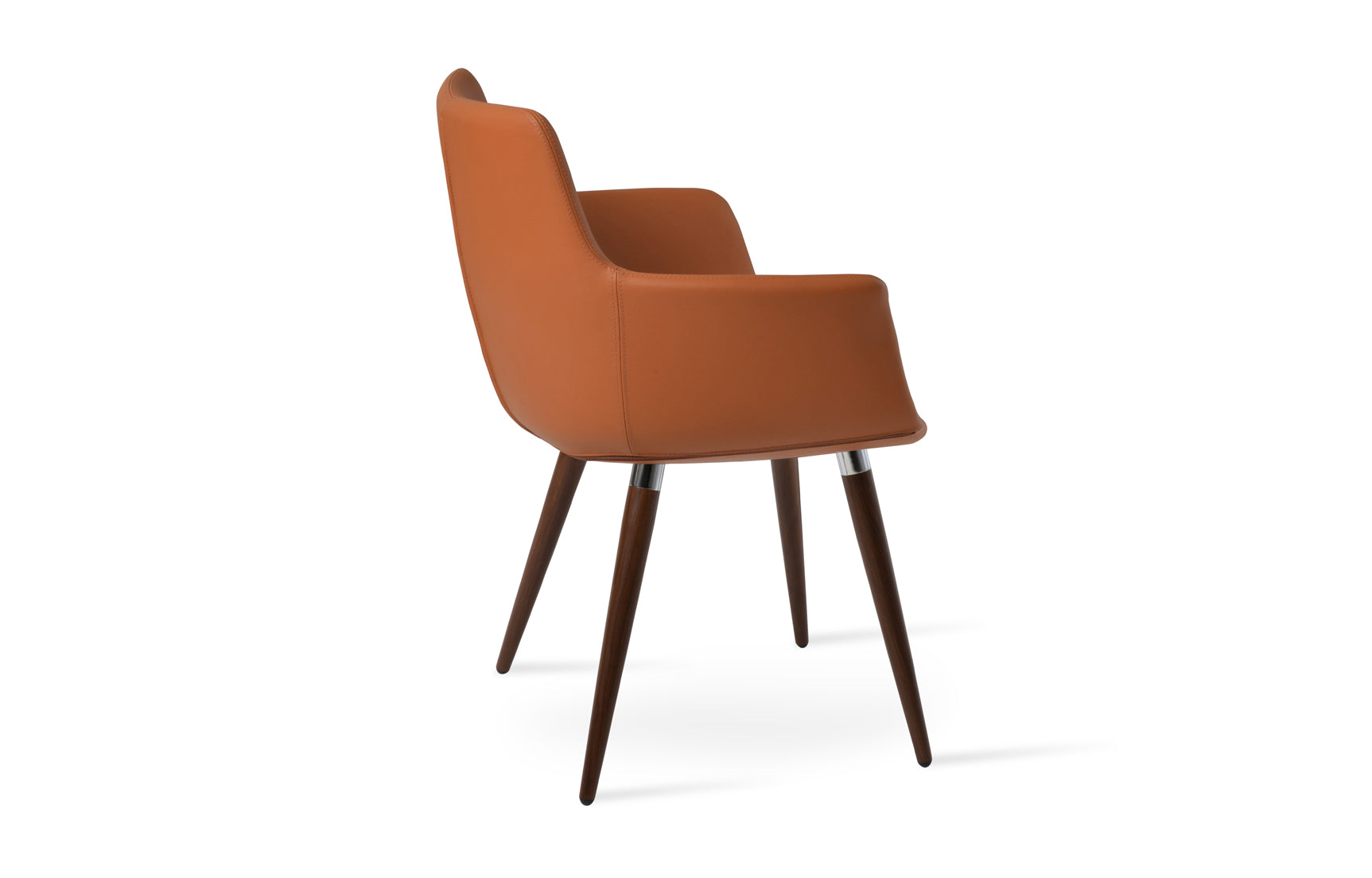 Bottega Ana is a unique dining chair with a comfortable upholstered seat and backrest on steel legs finished in black with gold bracelet and walnut finish with stainless steel polished bracelet. Each leg is tipped with a plastic glide screwed into the foot. The seat has a steel structure with “S” shape springs for extra flexibility and strength. This steel frame is molded by an injecting polyurethane foam. Bottega seat is upholstered with a removable zipper enclosed leather, PPM, leatherette or wool fabric slip cover. This contemporary chair is suitable for both residential and commercial use. Bottega Ana is designed by Tayfur Ozkaynak.