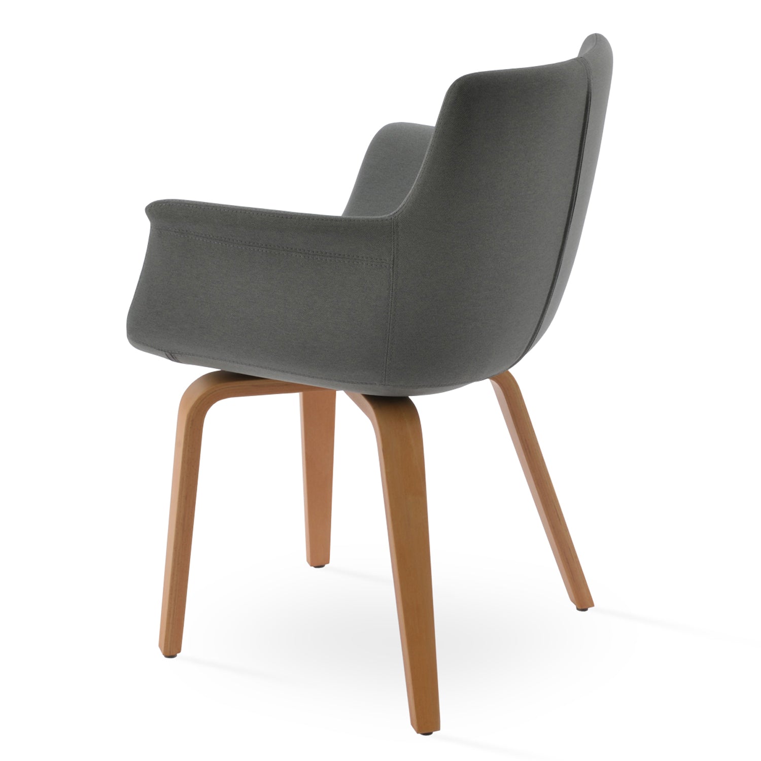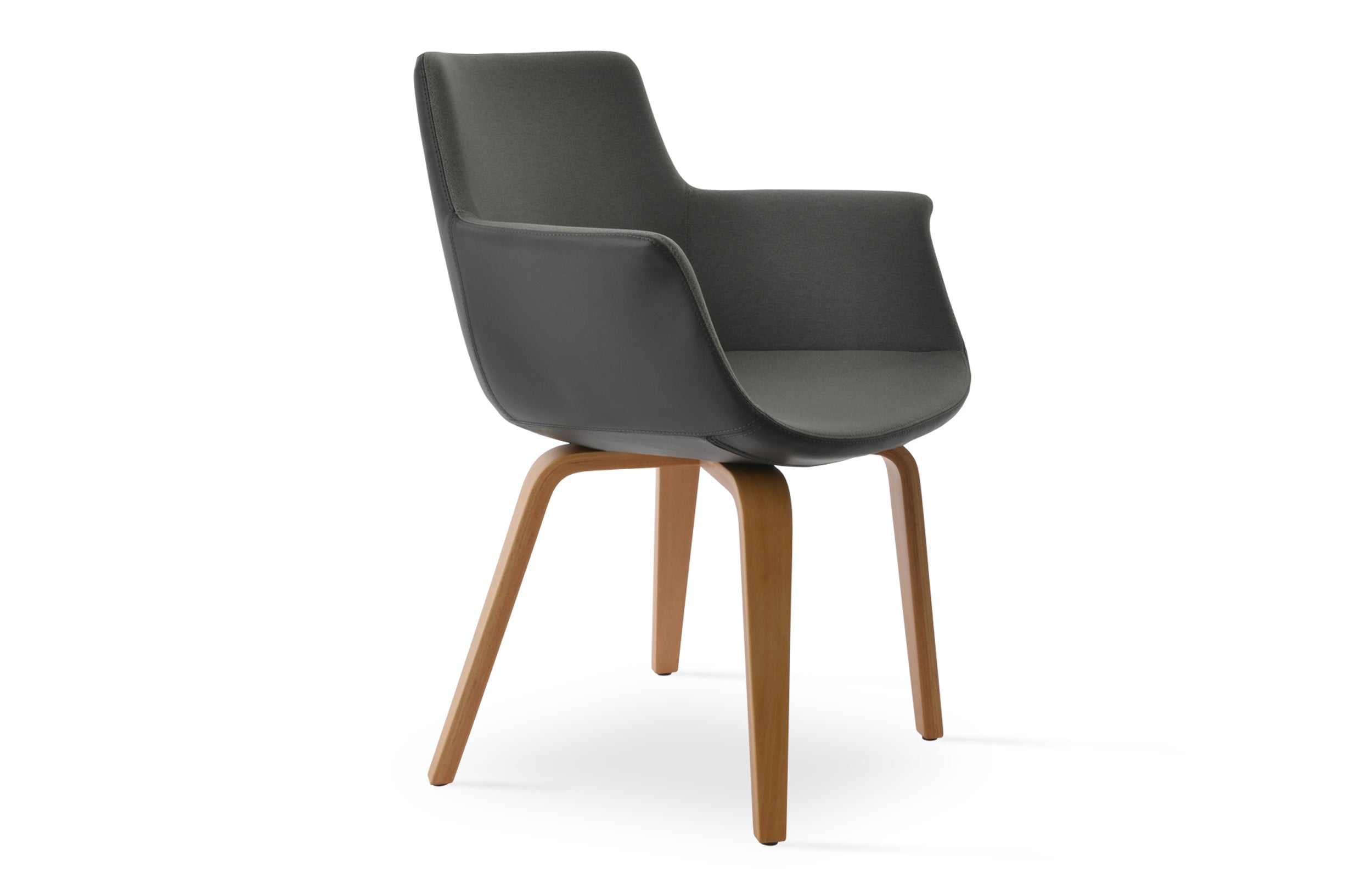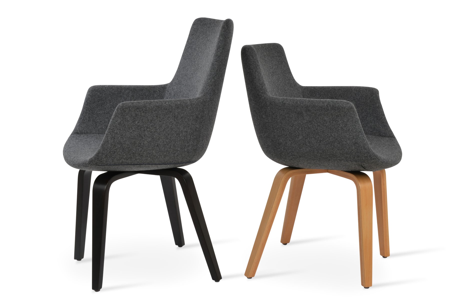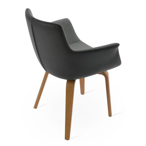 Bottega Plywood is a contemporary dining chair with a comfortable upholstered seat and backrest on wooden dowel legs. Bottega Plywood has wood legs available in walnut finish. The seat has a steel structure with βSβ shape springs for extra flexibility and strength. This steel frame molded by injecting polyurethane foam. Bottega seat is upholstered with a removable zipper enclosed leather, PPM, leatherette or wool fabric slip cover. Bottega Plywood may be upholstered with variety of other colors as a special order with a minimum of quantity required. This contemporary chair is suitable for both residential and commercial use. Bottega Plywood is designed by Tayfur Ozkaynak.