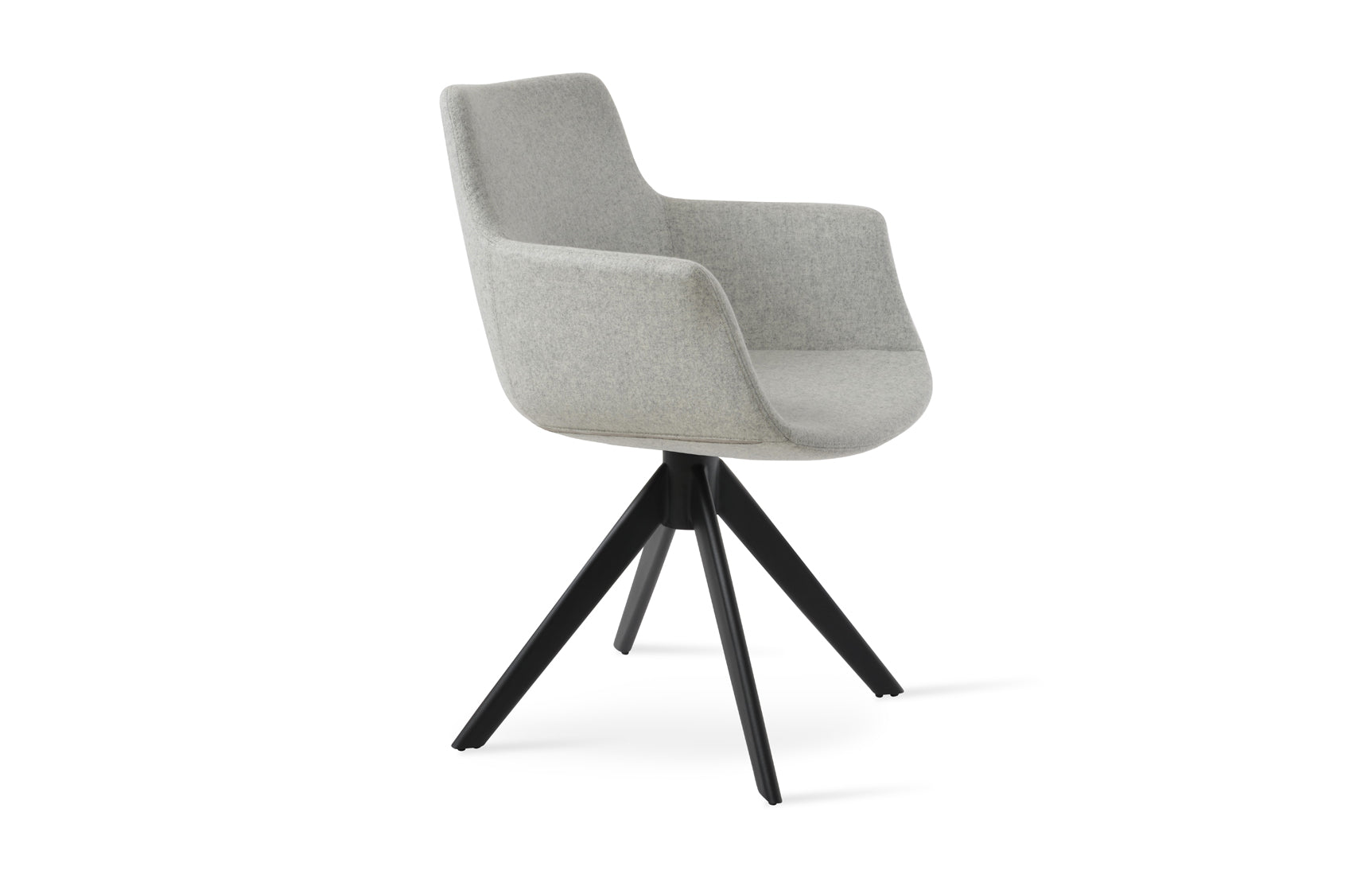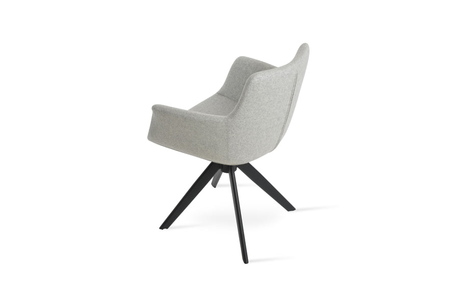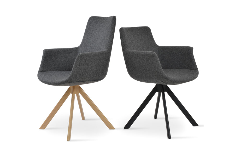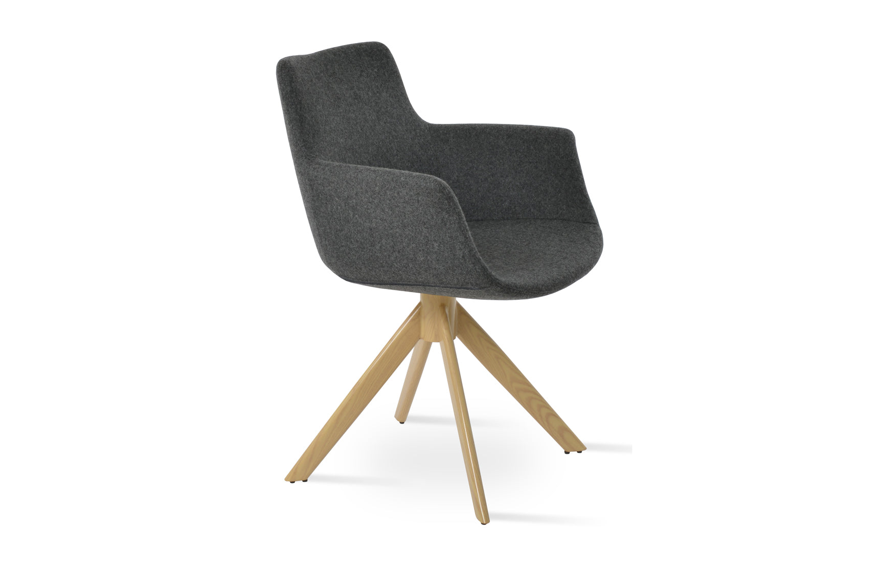 Bottega Sword is a unique dining chair with a comfortable upholstered seat and backrest on natural and walnut veneer steel base. Each leg is tipped with a plastic glide screwed into the foot. The seat has a steel structure with βSβ shape springs for extra flexibility and strength. This steel frame is molded by injecting polyurethane foam. Bottega seat is upholstered with a removable zipper enclosed leather, PPM, leatherette or wool fabric slip cover. This contemporary chair is suitable for both residential and commercial use. Bottega Sword is designed by Tayfur Ozkaynak.