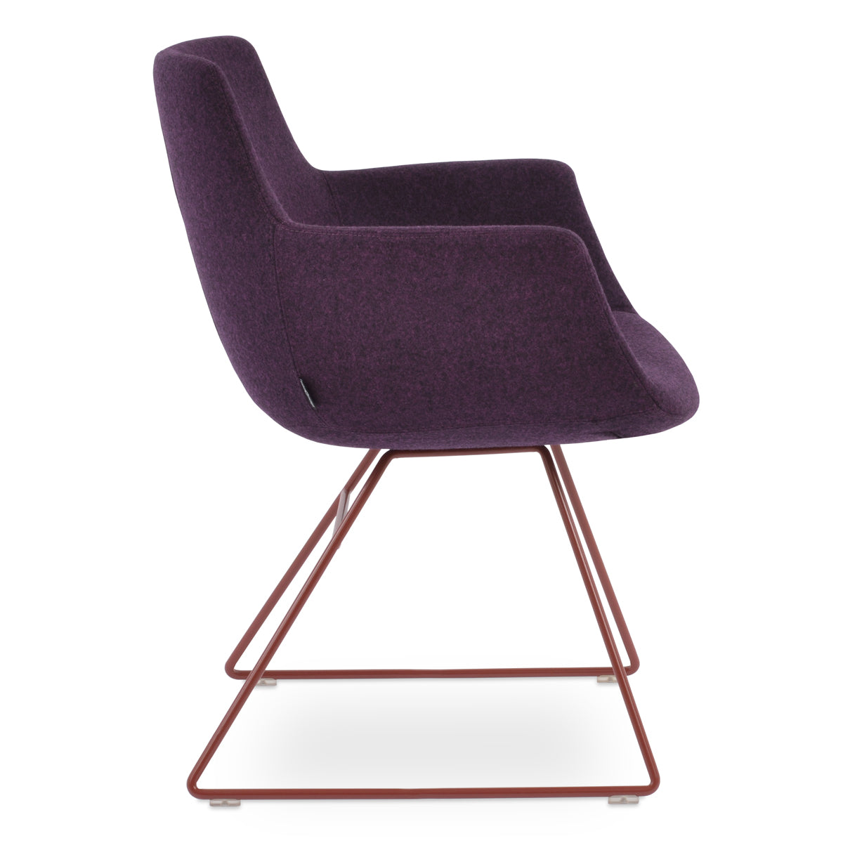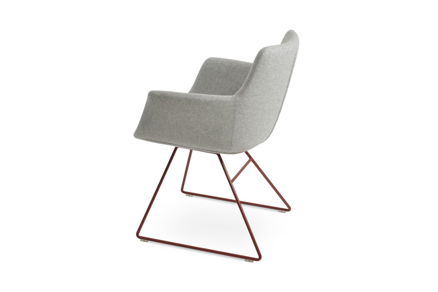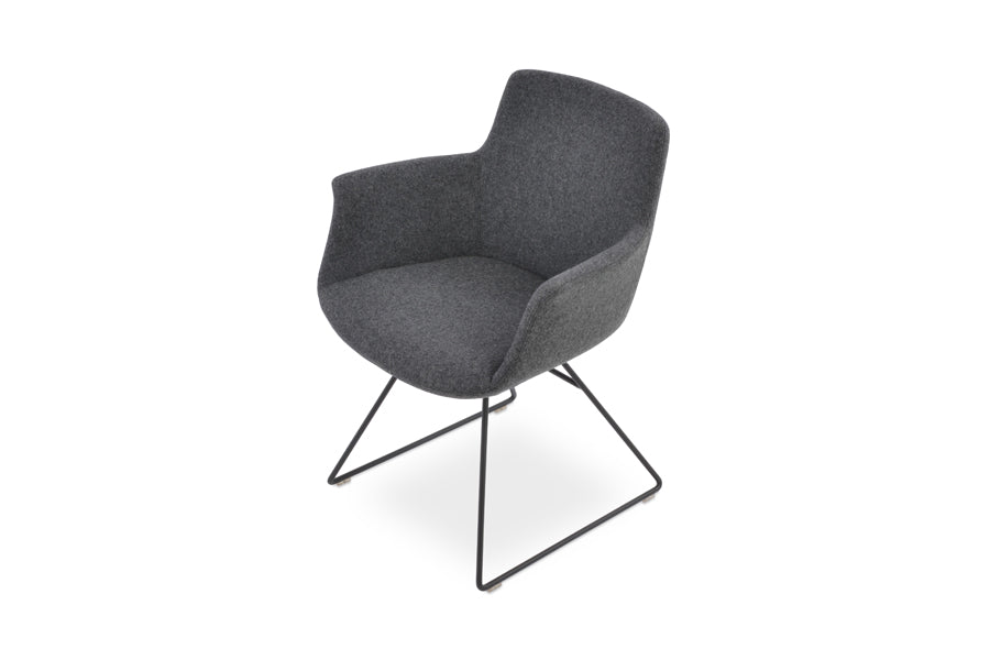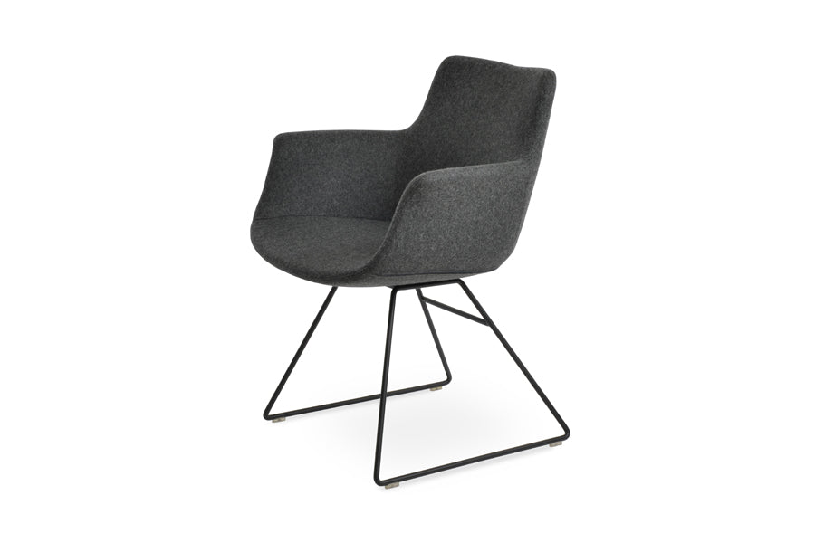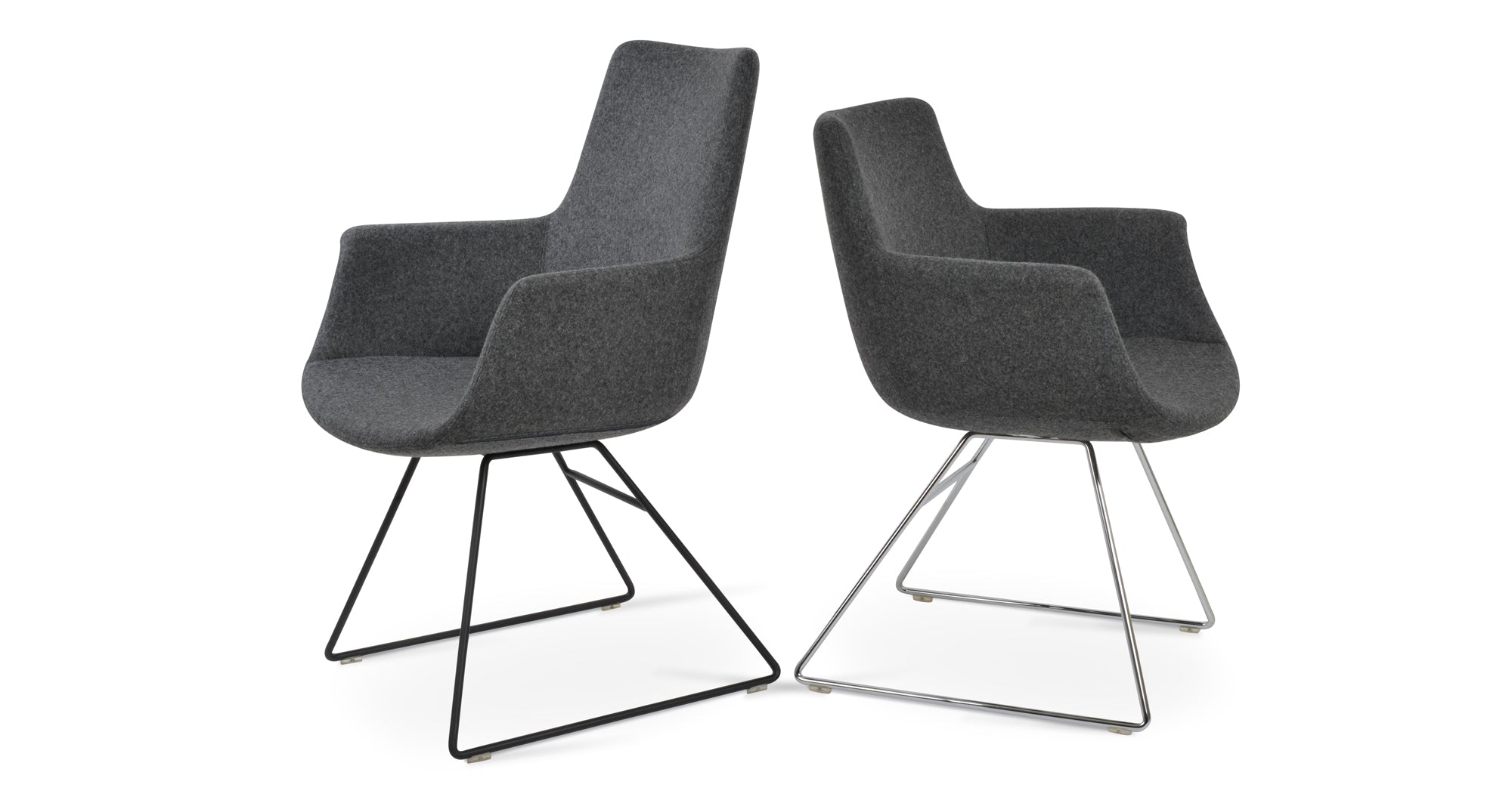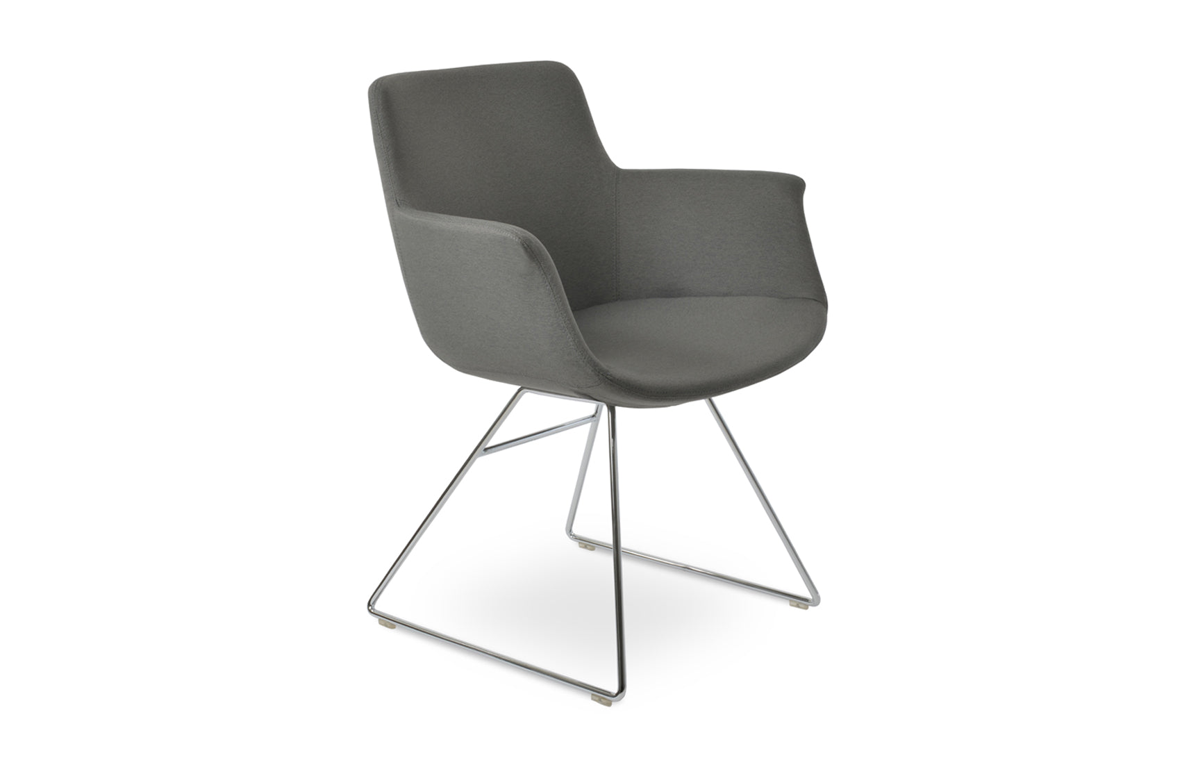 Bottega Wire is a contemporary dining chair with a comfortable upholstered seat and backrest on chrome steel sled base. The steel sled base can be finished in black or white powder coating. Each leg is tipped with a plastic glide embedded into the metal wire. The seat has a steel structure with “S” shape springs for extra flexibility and strength. This steel frame molded by injecting polyurethane foam. Bottega seat is upholstered with a removable zipper enclosed leather, PPM, leatherette or wool fabric slip cover. The chair is suitable for both residential and commercial use. Bottega Wire is designed by Tayfur Ozkaynak.