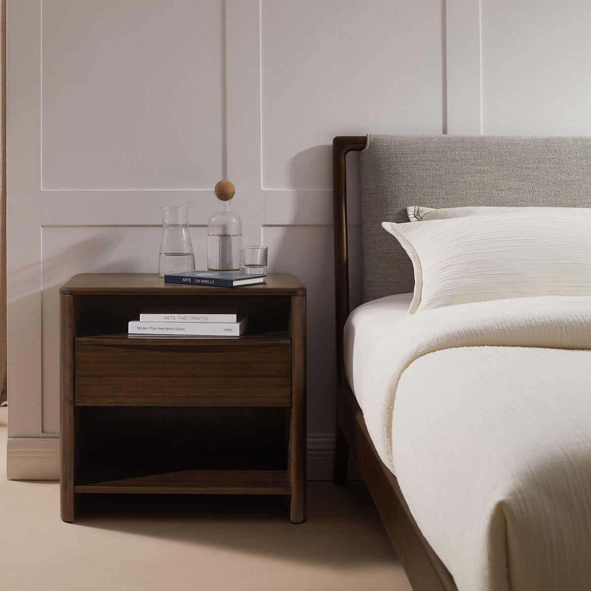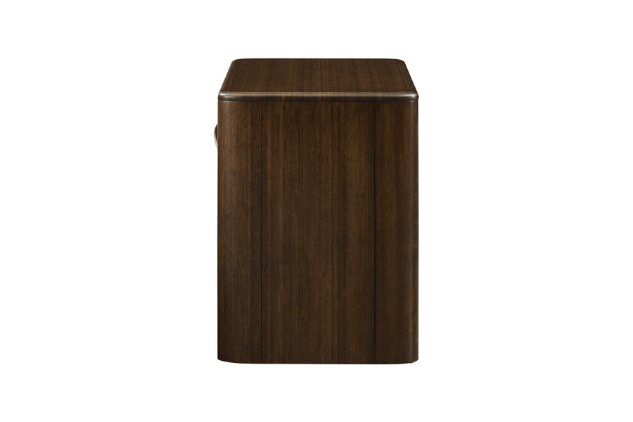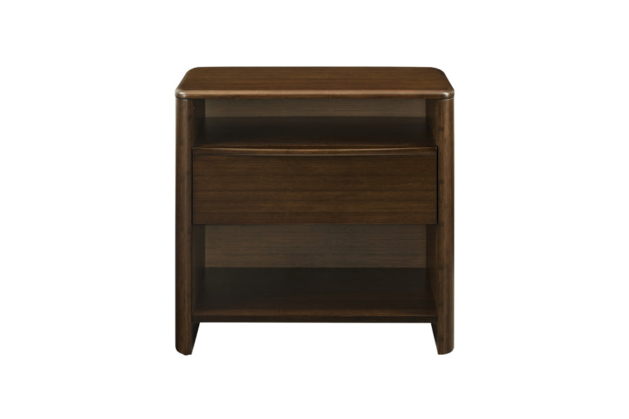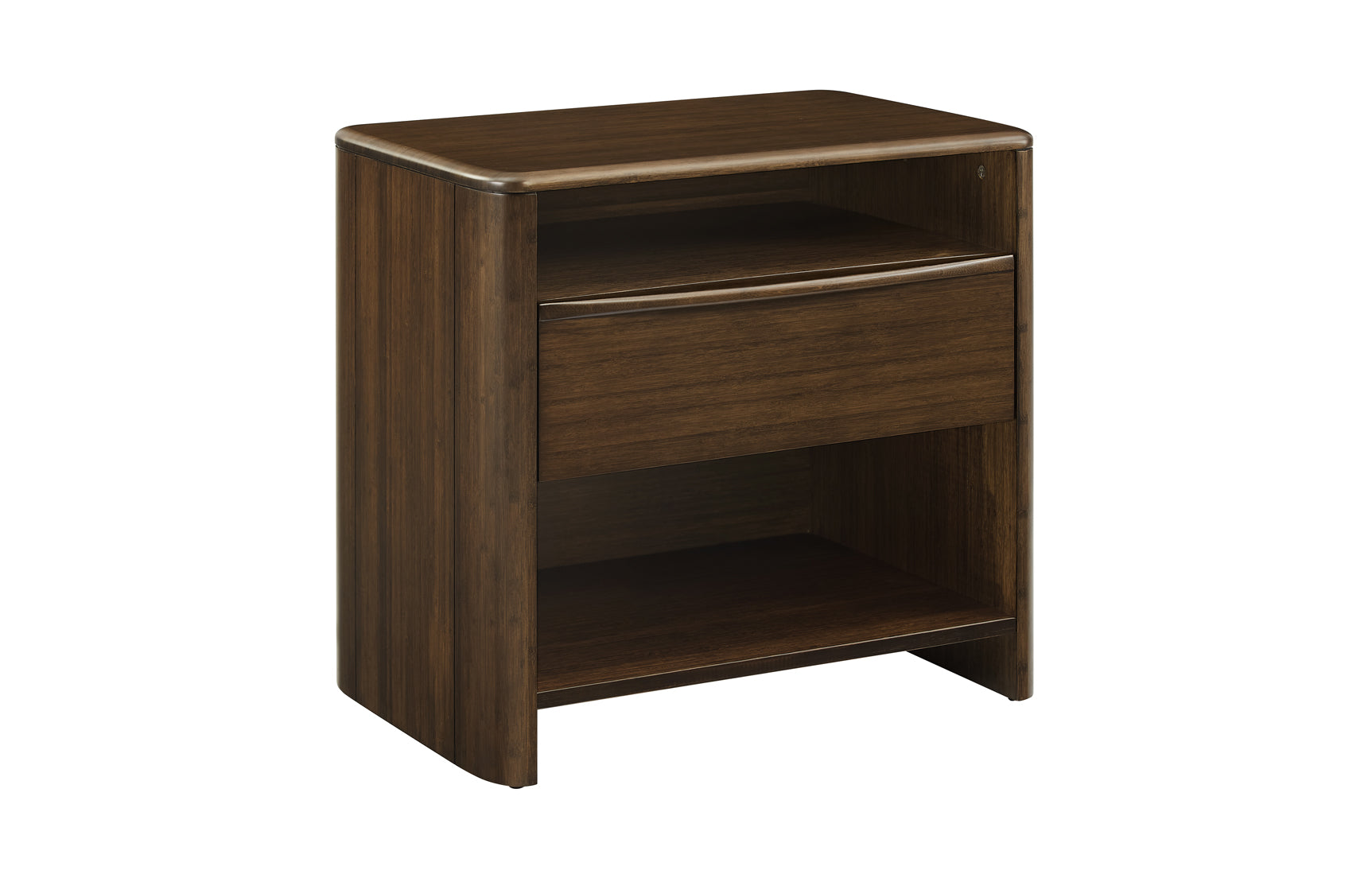 The Catalina nightstand features a softly modern design with an eye-catching solid bamboo frame and rounded edges, creating a gentle, contemporary look. The elongated, curved drawer pulls add a multi-dimensional effect to the piece. It offers two open shelves and one generously sized drawer, crafted from solid bamboo and finished inside and out. The drawer box is constructed using English dovetail joinery and equipped with soft-closing under-mount drawer glides for smooth, quiet operation. Sustainably crafted and finished in a rich Black Walnut, each piece of the Catalina nightstand is unique, with variations in bamboo grain and color that enrich the natural beauty of the furniture. These slight differences are a testament to the high-quality craftsmanship that makes solid bamboo furniture a benchmark of excellence. Bamboo is a rapidly renewable resource, your purchase of Catalina contributes to the preservation of forests and ecosystems worldwide, making the Catalina nightstand an environmentally friendly choice for your home.