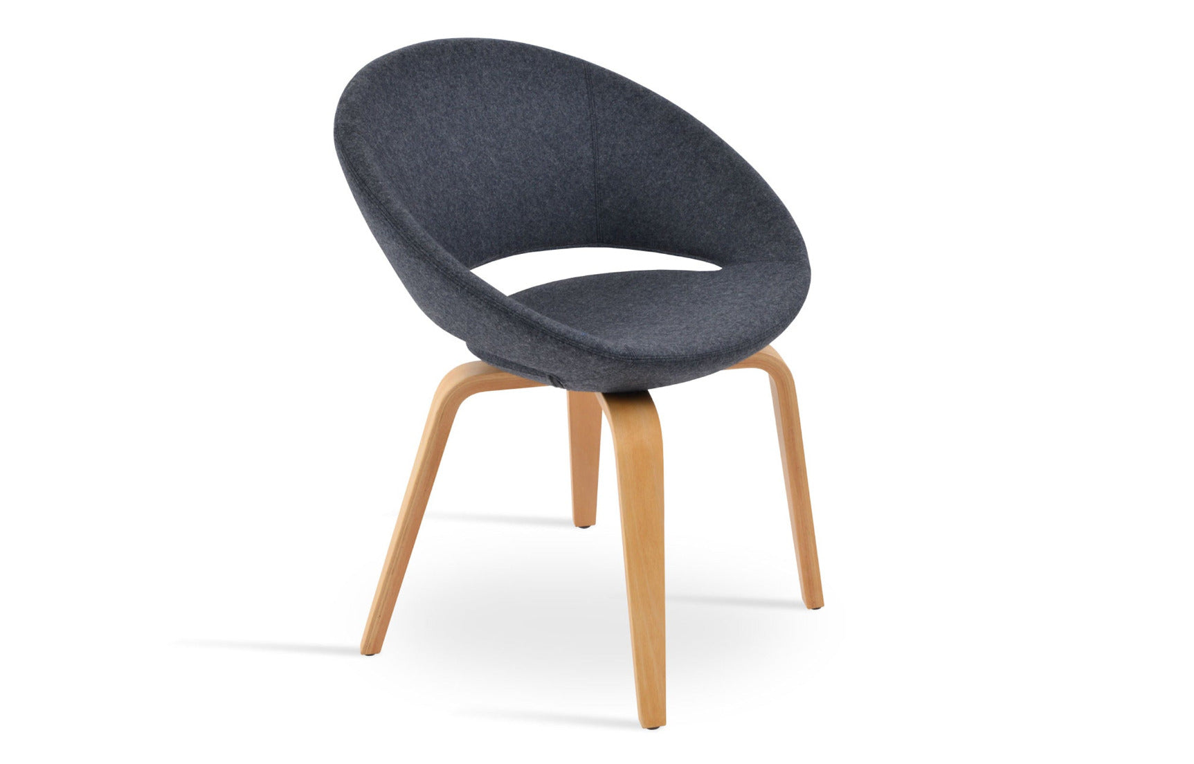 Crescent Plywood is a contemporary dining chair with a comfortable upholstered seat and backrest on wooden dowel legs. Crescent Plywood has wood legs available in walnut finish. The seat has a steel structure with βSβ shape springs for extra flexibility and strength. This steel frame molded by injecting polyurethane foam. Crescent seat is upholstered with a removable zipper enclosed leather, PPM, leatherette or wool fabric slip cover. Crescent Plywood may be upholstered with variety of other colors as a special order with a minimum of quantity required. This contemporary chair is suitable for both residential and commercial use. Crescent Plywood is designed by Tayfur Ozkaynak.