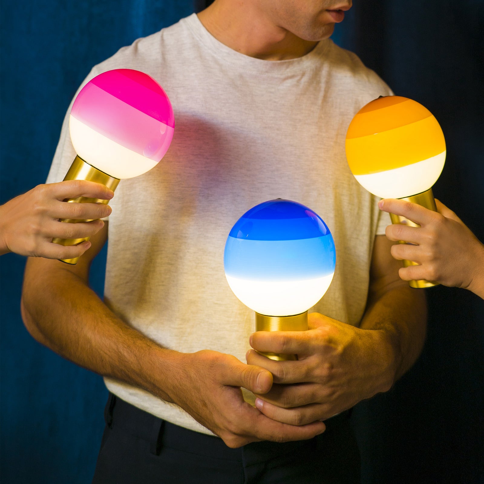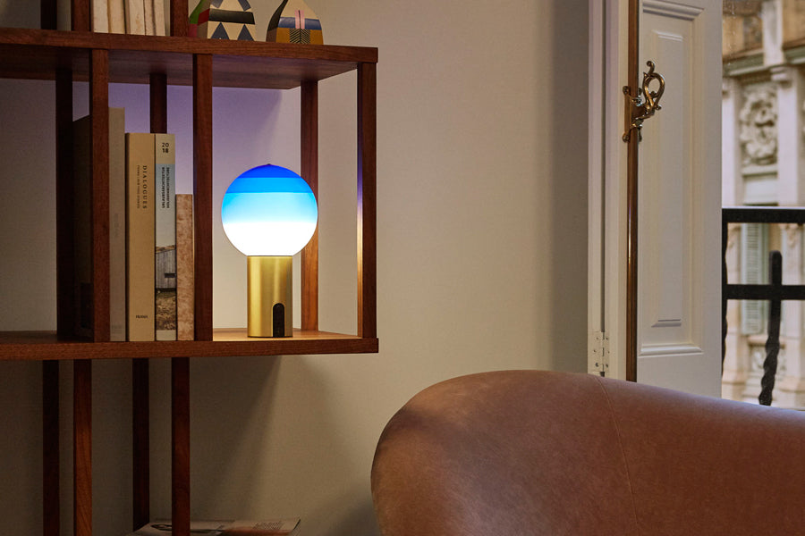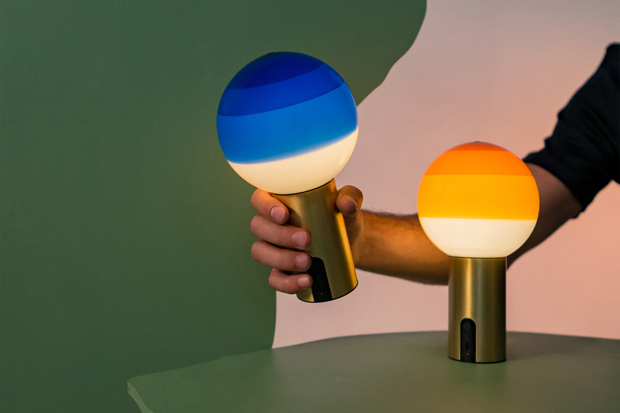 The history of the Dipping Light has only just begun. Marset wasn’t willing to settle for just the two table lamp sizes it has come in so far. Its most poetic light expands its uses and is now offered as a portable lamp, suspension lamp, wall lamp and a new table lamp size –ø8 inches– to bridge the gap between the small and large sizes. The colors are the same, with an expanded model line-up. The new portable Dipping Light relies on a battery to forego the cable. It has a switch at the base and, like the other Marset portable lamps, features a dimmer to set the light output at one of three intensities. Small but important changes to make it completely mobile. It can also be purchased with a metal base so the lamp can be set atop a table.