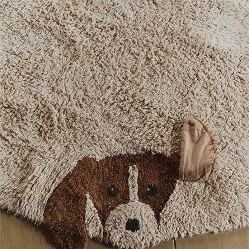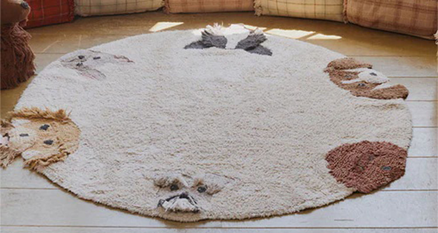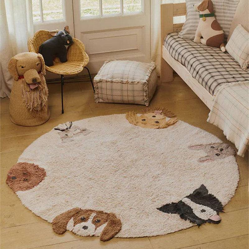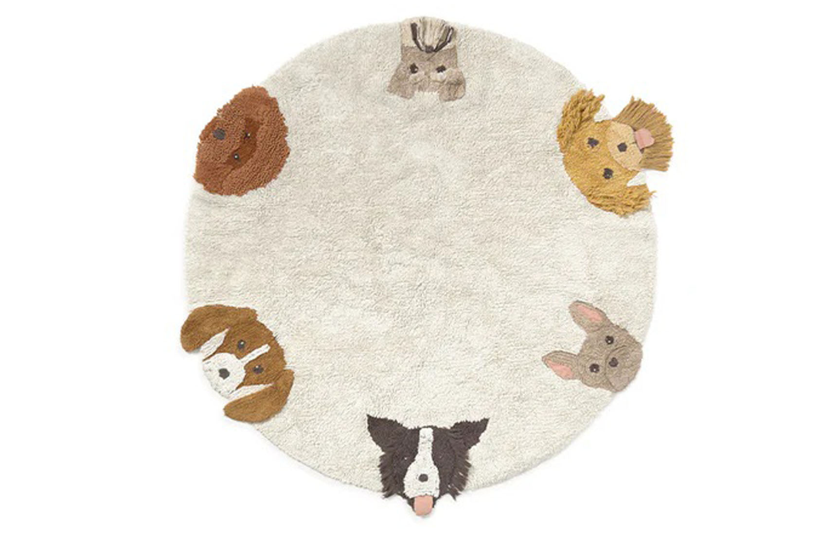 Meet your six favorite furry friends! A round washable rug in natural color, featuring the friendly faces of different lovable dog breeds. Each dog is handcrafted, with unique details like 3D ears, interactive tongues, whiskers, beards, and eyes made with knots to give them a realistic touch.