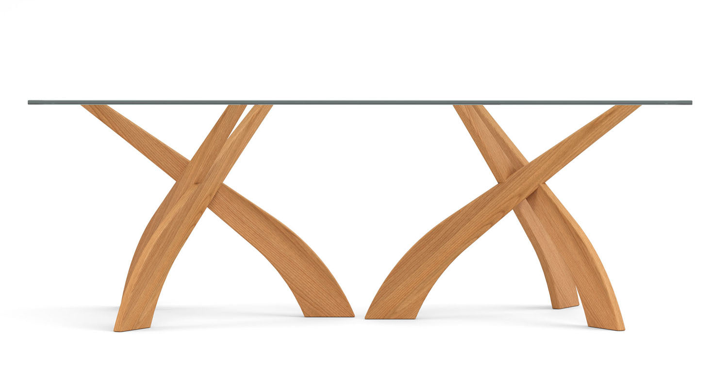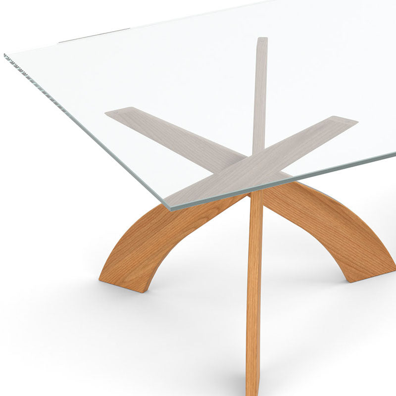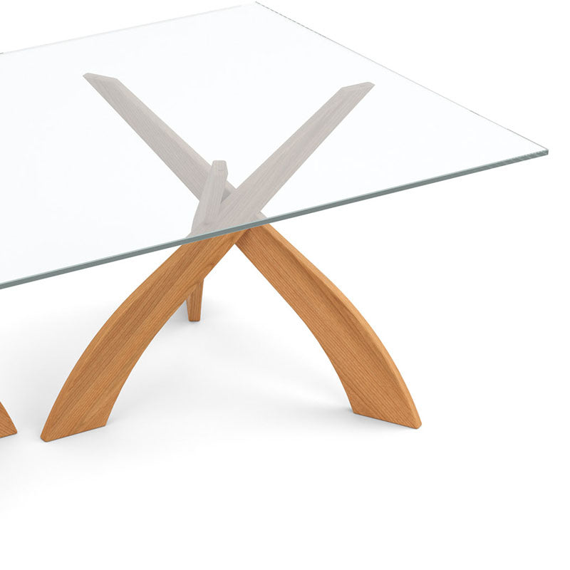 The Tables are crafted in solid American black walnut hardwood and topped with clear tempered 15 mm glass (glass tops are imported). Bases are also available in solid cherry in several finishes. Tables in walnut finished with a low sheen (10 sheen) top coat. The finish is GREENGUARD Certified for low chemical emissions.