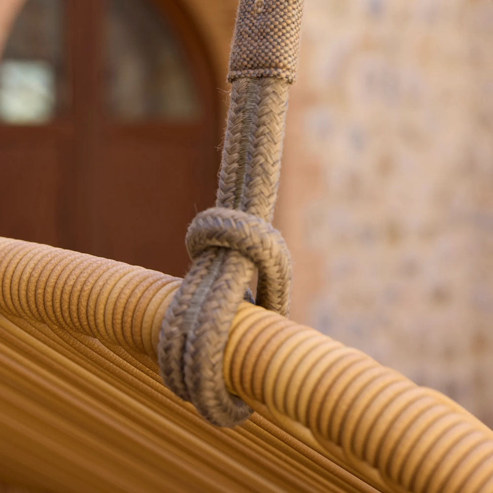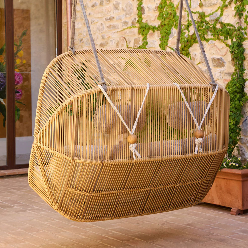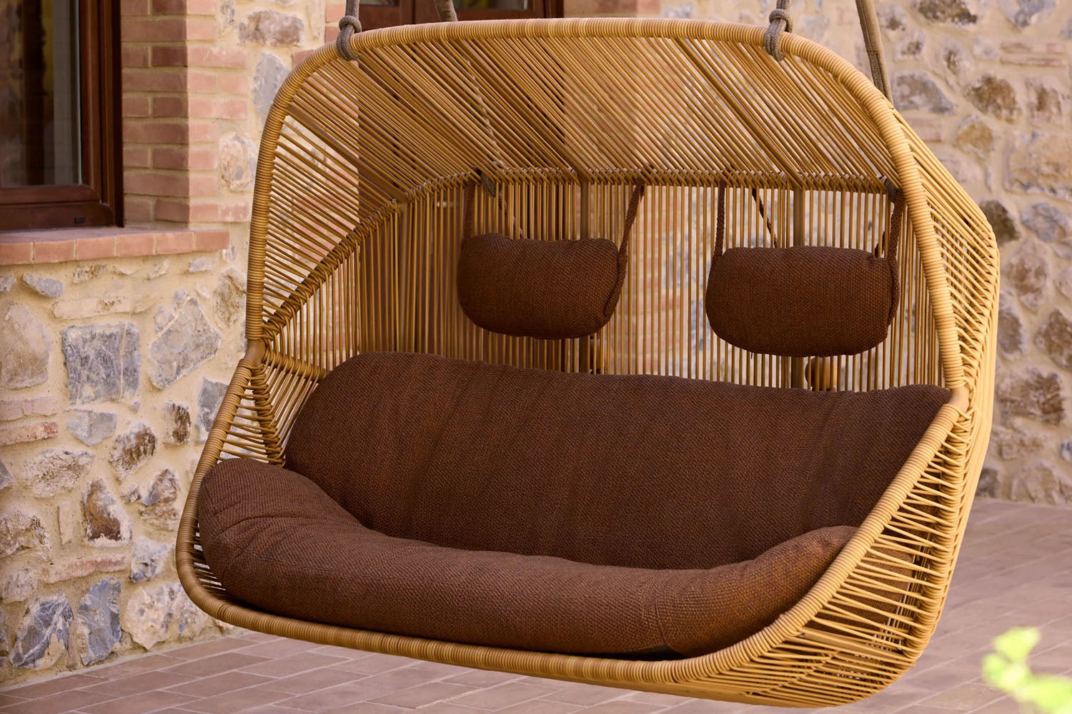 The Hive 2-seater sofa exudes a sculptural elegance that makes it an eye-catching centerpiece in any outdoor space, whether as a standalone piece or part of a larger setup. The sofa, designed by Foersom & Hiort-Lorenzen MDD, takes inspiration from the natural shape of a beehive. Its organic form invites you to unwind and enjoy moments of reflection and relaxation in a unique, embracing design. The Hive sofa is handwoven in the weather-resistant Cane-line Weave® in a delicate and artistic wicker pattern, which brings both style and durability to your outdoor space. It can be placed hanging in a rope for a playful, floating effect or placed on a solid base in premium teak, allowing for versatile placement. The generous cushions, featuring the QuickDry & Airflow system, ensure rapid drying after a downpour, providing long-lasting comfort in any weather.