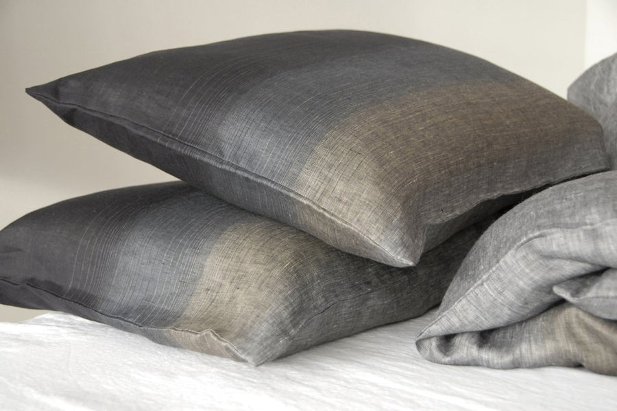 2 products are in the INES bedding collection. Pure linen duvets and pillowcases in attractive, gradient stripes that seem to float into each other, creating interplaying layers of tone and texture. GREY is an intriguing dark blue-black grey. SAND is neutral in shades of warm beige and dusky grey. WHITE is light and airy with cool beige and steel grey.