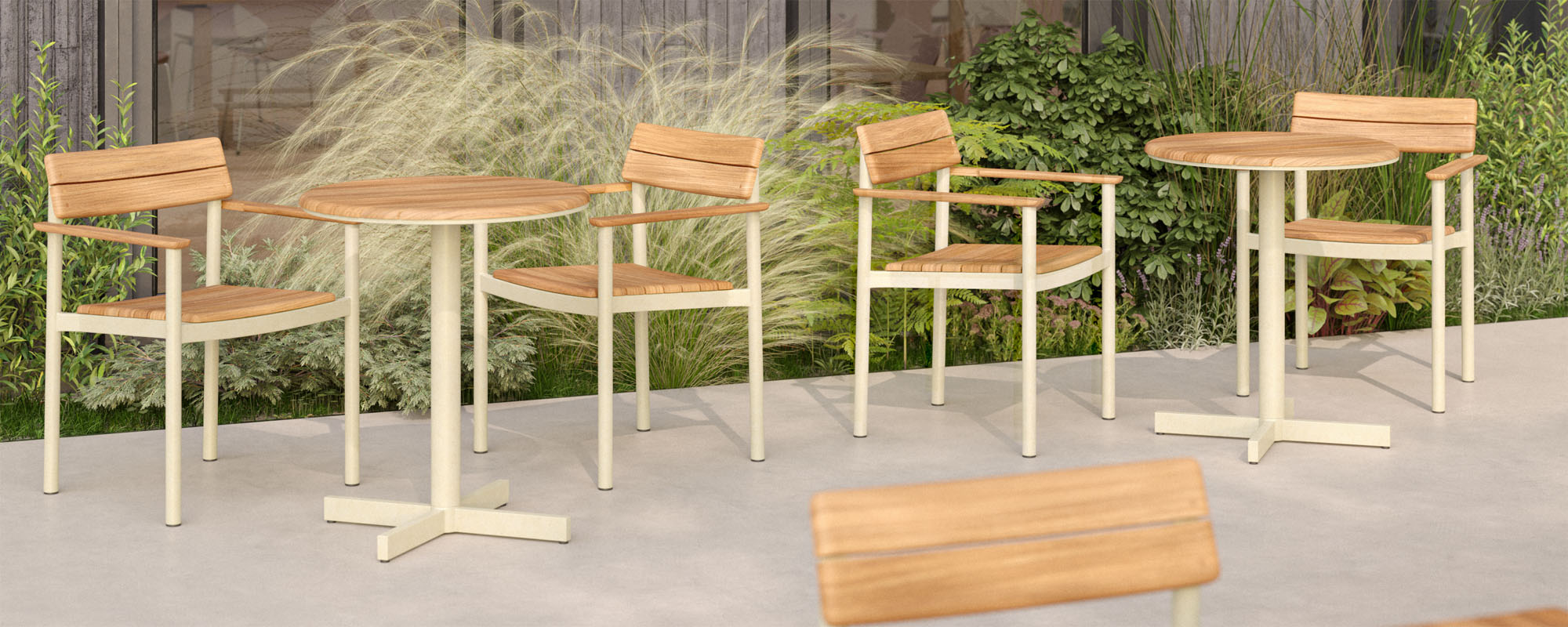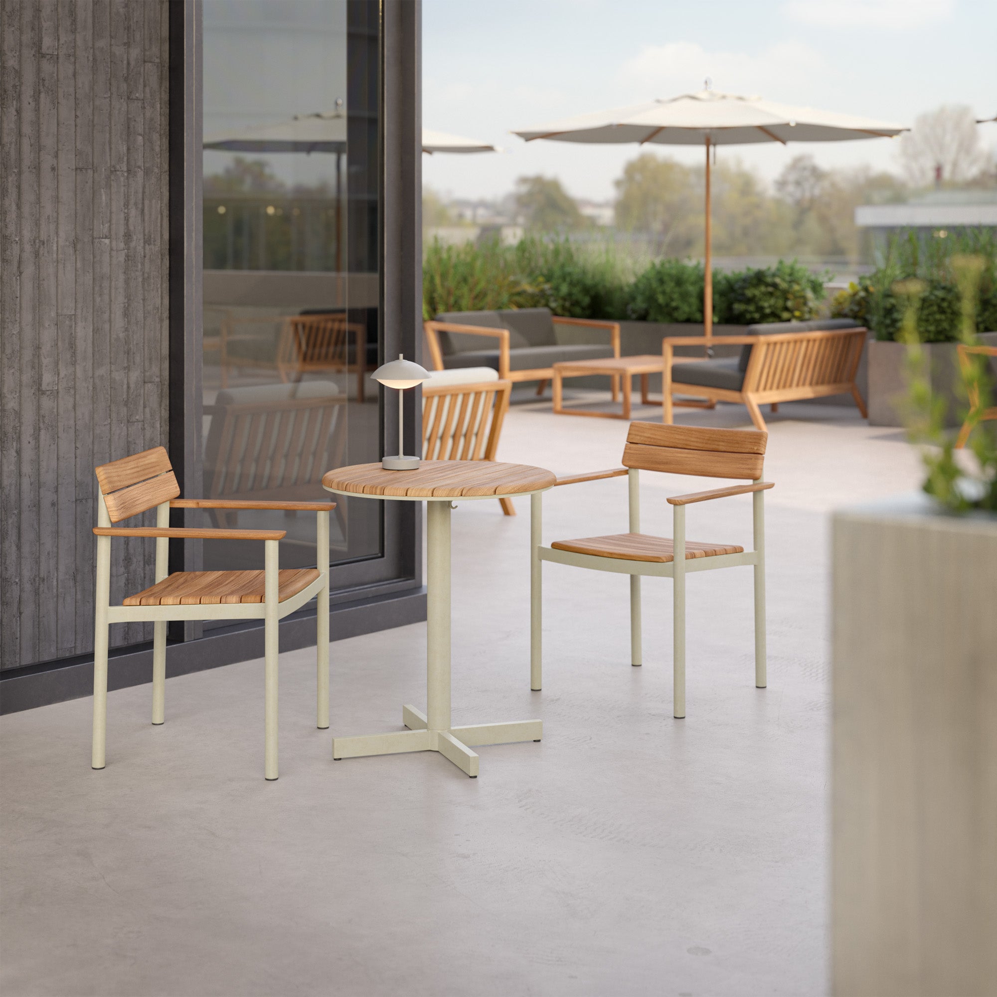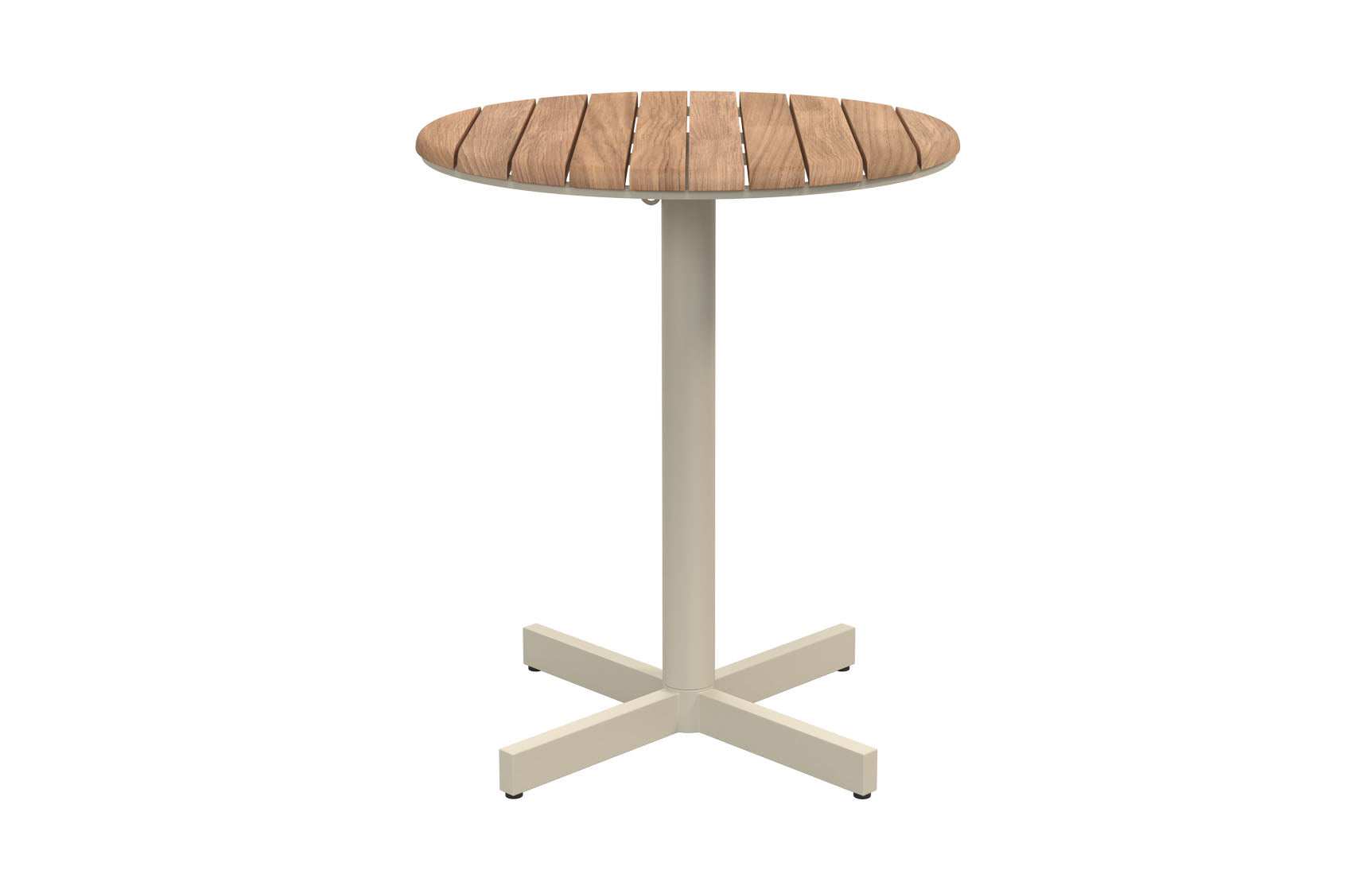 The Pelagus Café Table (Ø62.5cm) features a round, centre-based design with a solid teak tabletop and a powder-coated aluminium frame, available in Light Ivory and Hunter Green. Fitted with a dual hook/linking device beneath the tabletop, it allows for secure linking of tables or holds a small bag, combining functionality with minimalist style.