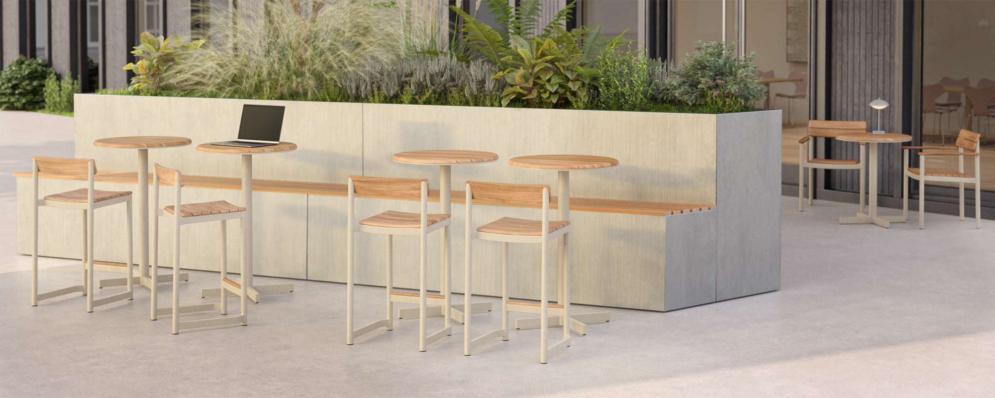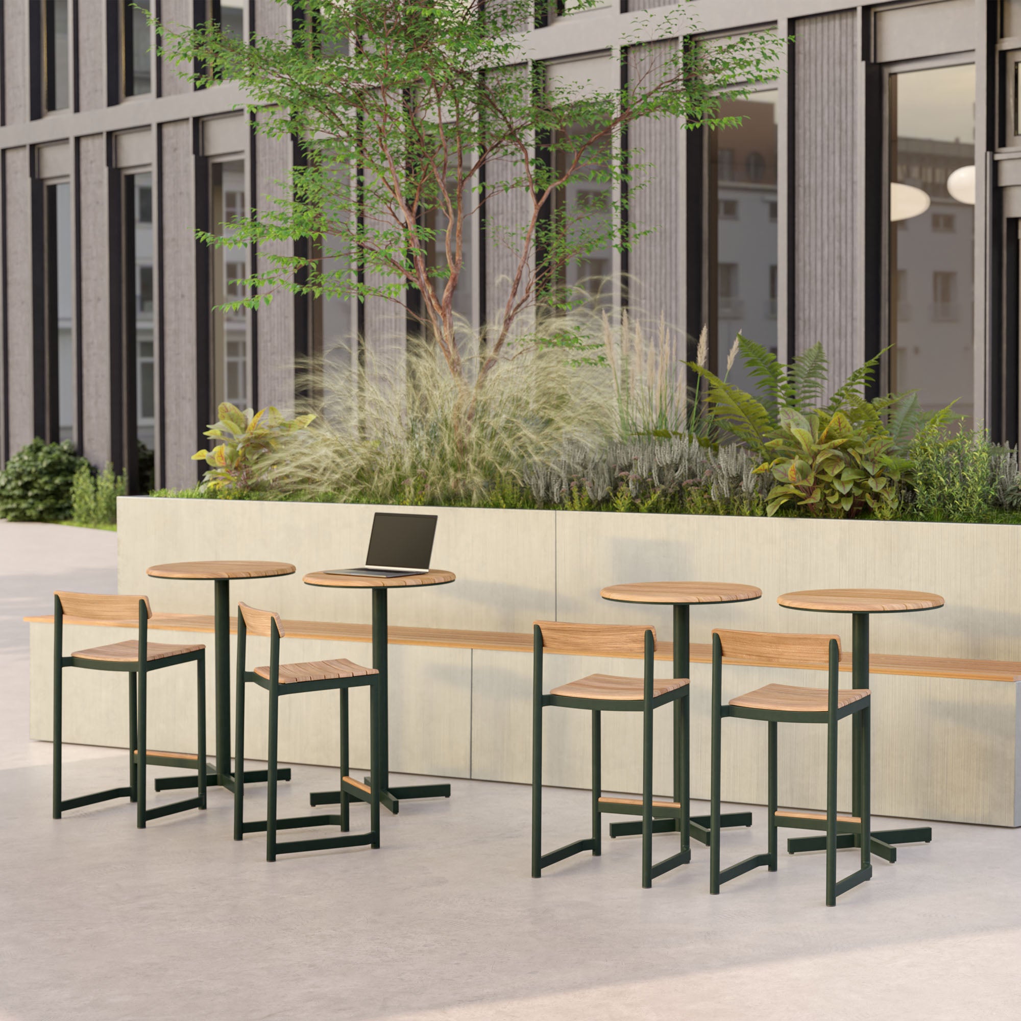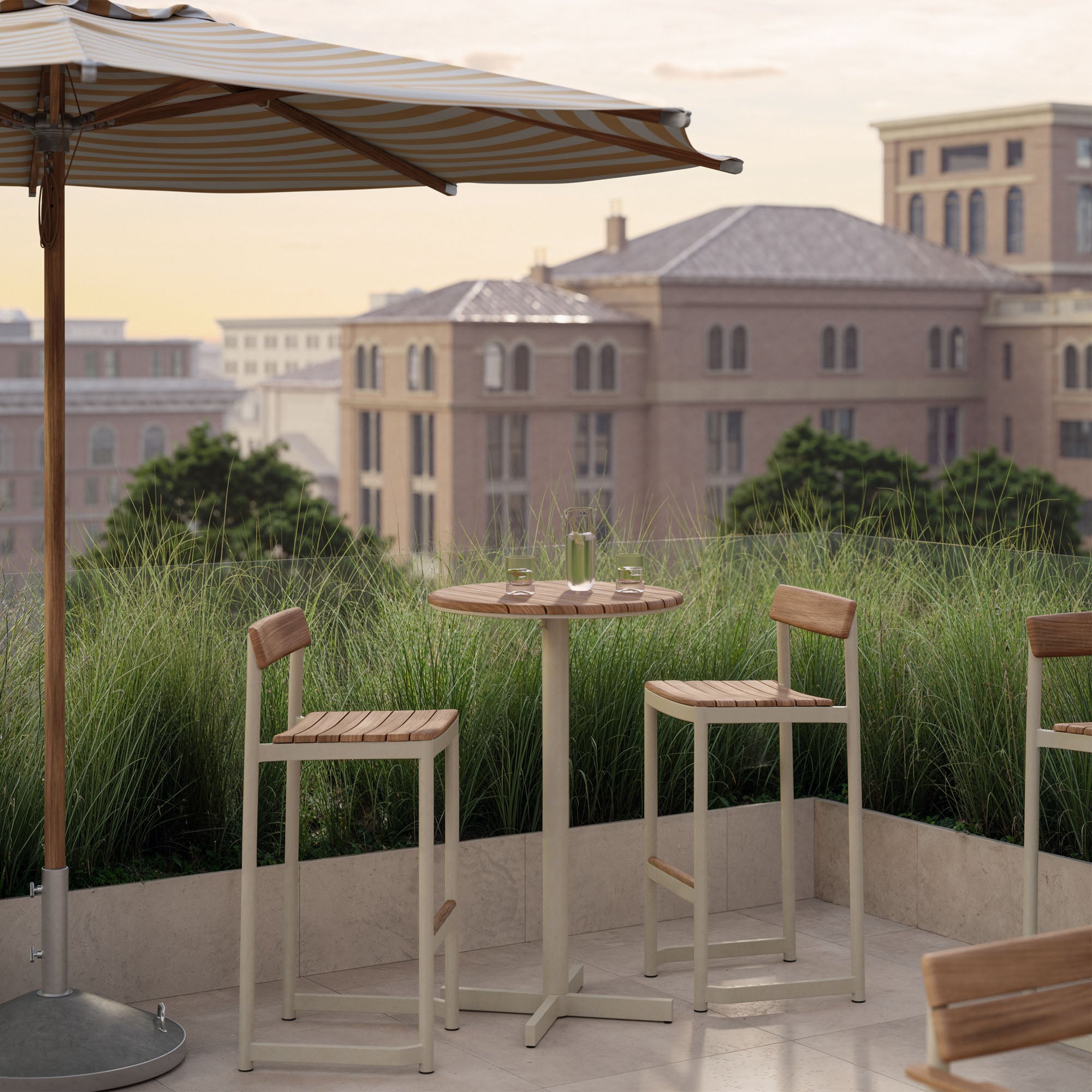 The Pelagus High Table (105 cm height) features a round, centre-based design that pairs a solid teak tabletop (Ø62.5cm) with a powder-coated aluminium frame, available in Light Ivory and Hunter Green. Designed to pair seamlessly with the Pelagus Bar Stool, it is fitted with a dual hook/linking device beneath the tabletop for easy linking with other tables or holding a small bagβ€”combining functionality with minimalist style.