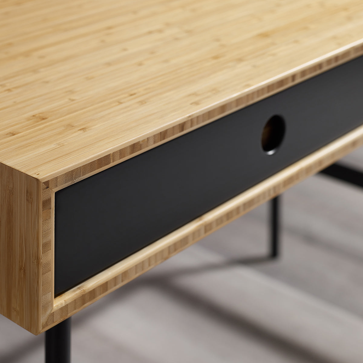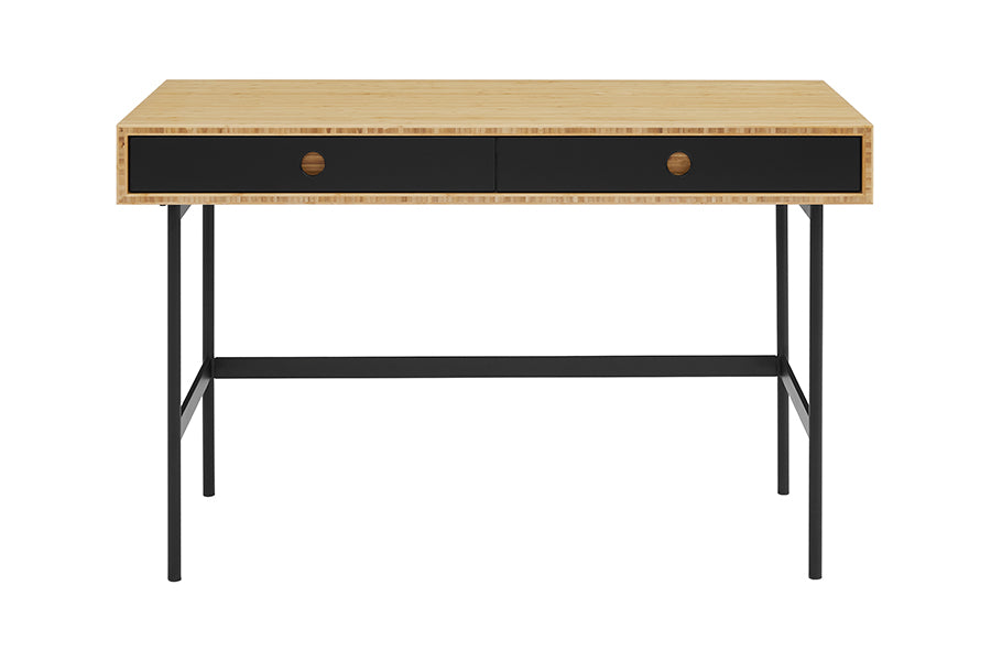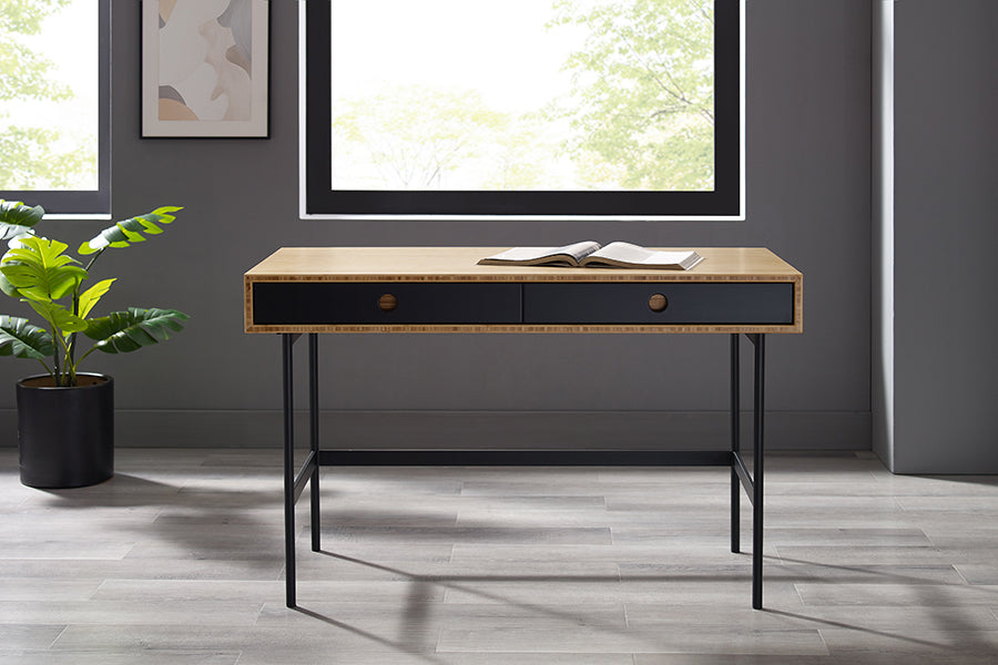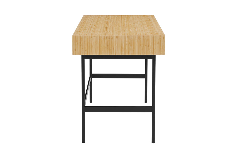 Handsome and hardworking, the Santa Cruz writing desk highlights a contrast of bamboo materials for a casual, modern look. A solid Wheat bamboo desktop surrounds contrasting matte black drawer faces allowing the natural grain of the bamboo to shine. Sustainable and earth friendly, Wheat finish is not a surface stain, the color is the result of an innovative process using heat, steam, and pressure to transform the solid bamboo material into Wheat’s variety of tones. The environmentally safe finish displays a beautiful grain pattern with continuous color throughout the material. Variation in grain and color enrich the natural beauty of bamboo furniture and make each piece unique. Slight differences in bamboo shade colors are signs that the furniture has been crafted from solid bamboo and is considered a benchmark of quality. Santa Cruz features two solid Wheat bamboo drawer boxes which are finished inside and out, constructed using English dovetail joinery, and providing plenty of storage for everyday essentials. Santa Cruz features a light and airy silhouette, slim black powder coated steel legs, and built-in drawers for a balanced and uncluttered workspace. Greenington is produced in an ISO 14001 Environment Management certified facility, your purchase of this environmentally friendly bamboo product helps support forests and ecosystems worldwide. Discover the expert artisanship packed into each piece of Greenington bamboo furniture. Made using an eco-friendly, renewable resource harvested from fully sustainable and rapidly growing forests.