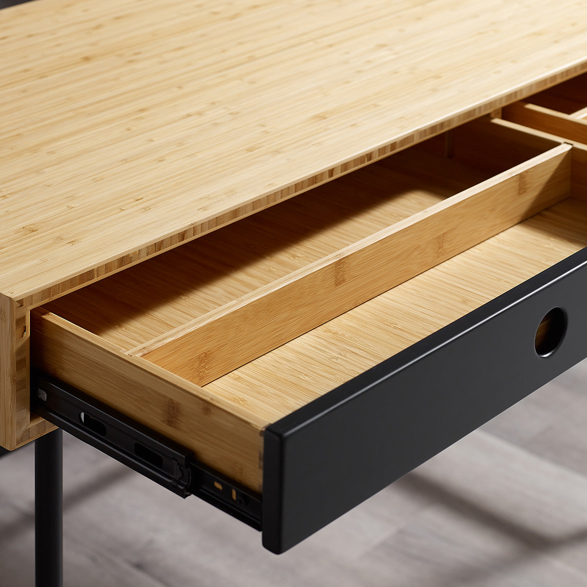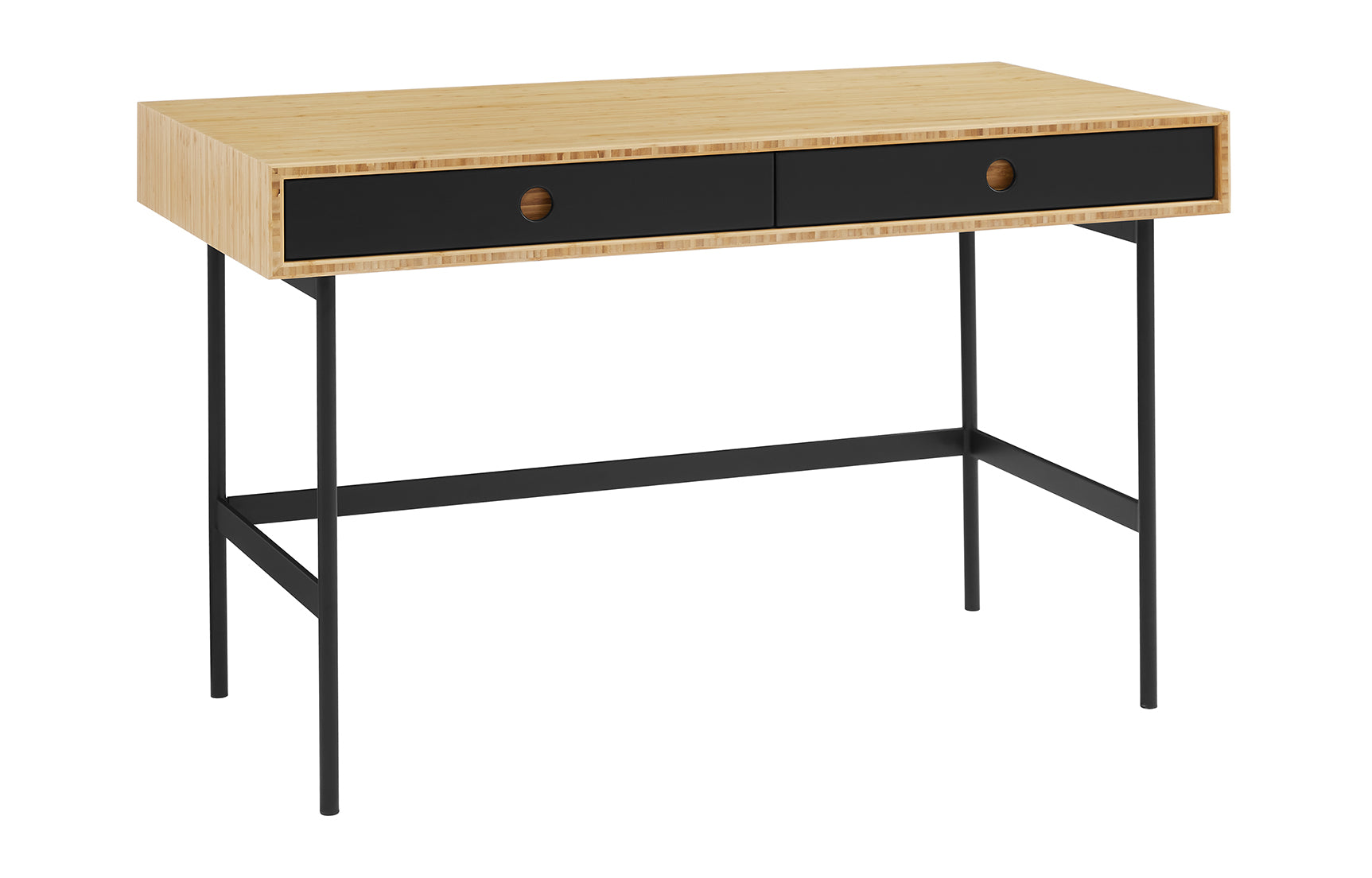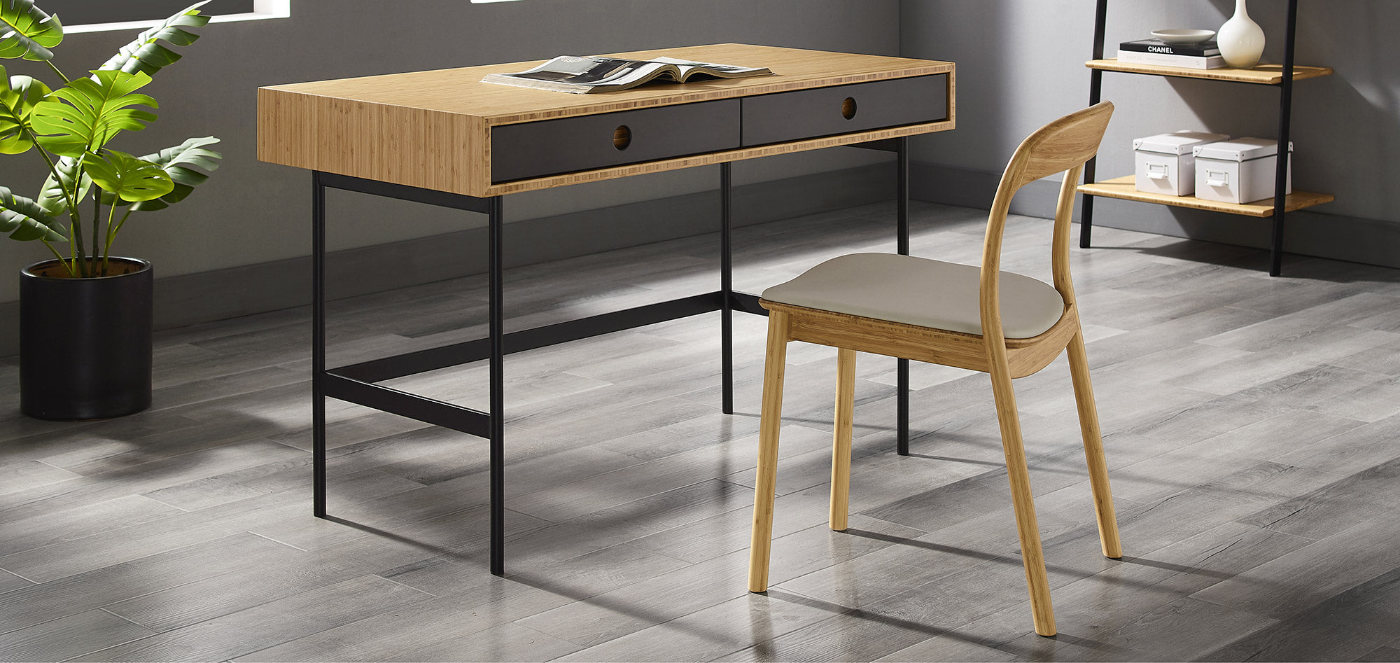 Handsome and hardworking, the Santa Cruz writing desk highlights a contrast of bamboo materials for a casual, modern look. A solid Wheat bamboo desktop surrounds contrasting matte black drawer faces allowing the natural grain of the bamboo to shine. Sustainable and earth friendly, Wheat finish is not a surface stain, the color is the result of an innovative process using heat, steam, and pressure to transform the solid bamboo material into Wheat’s variety of tones. The environmentally safe finish displays a beautiful grain pattern with continuous color throughout the material. Variation in grain and color enrich the natural beauty of bamboo furniture and make each piece unique. Slight differences in bamboo shade colors are signs that the furniture has been crafted from solid bamboo and is considered a benchmark of quality. Santa Cruz features two solid Wheat bamboo drawer boxes which are finished inside and out, constructed using English dovetail joinery, and providing plenty of storage for everyday essentials. Santa Cruz features a light and airy silhouette, slim black powder coated steel legs, and built-in drawers for a balanced and uncluttered workspace. Greenington is produced in an ISO 14001 Environment Management certified facility, your purchase of this environmentally friendly bamboo product helps support forests and ecosystems worldwide. Discover the expert artisanship packed into each piece of Greenington bamboo furniture. Made using an eco-friendly, renewable resource harvested from fully sustainable and rapidly growing forests.