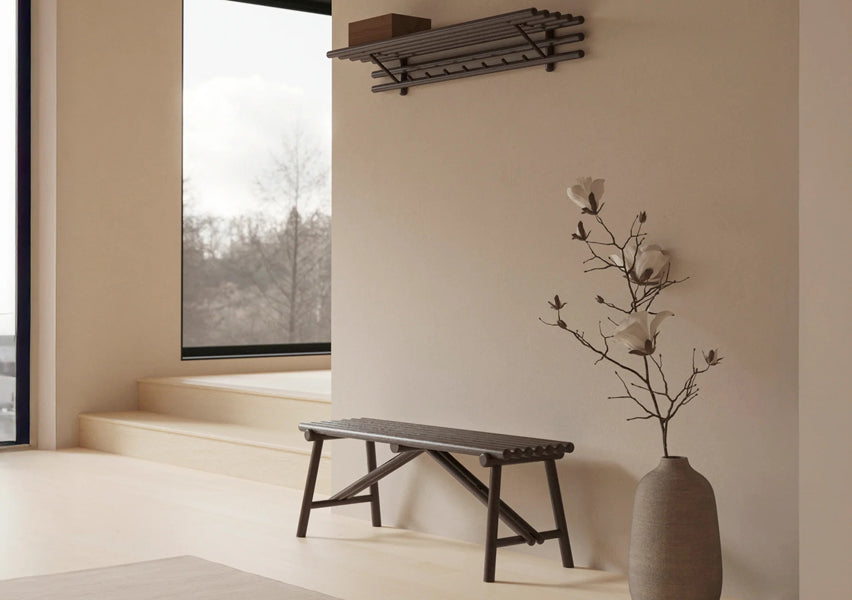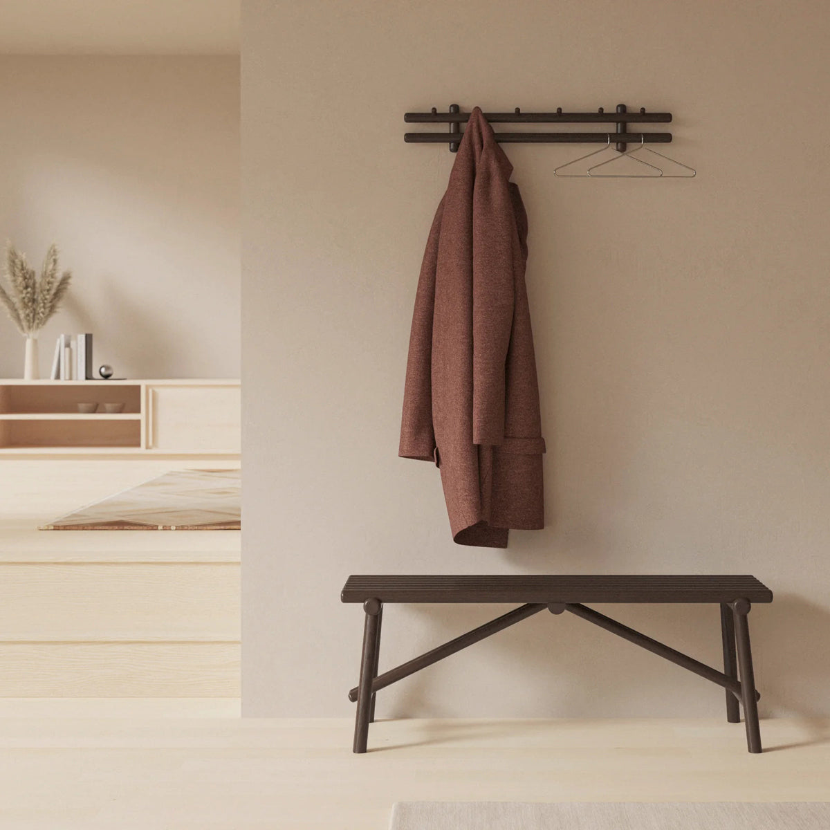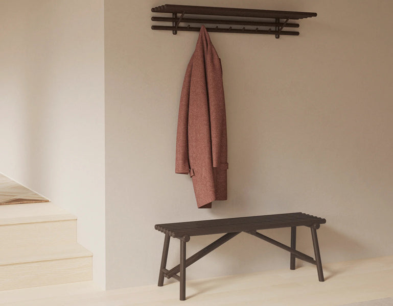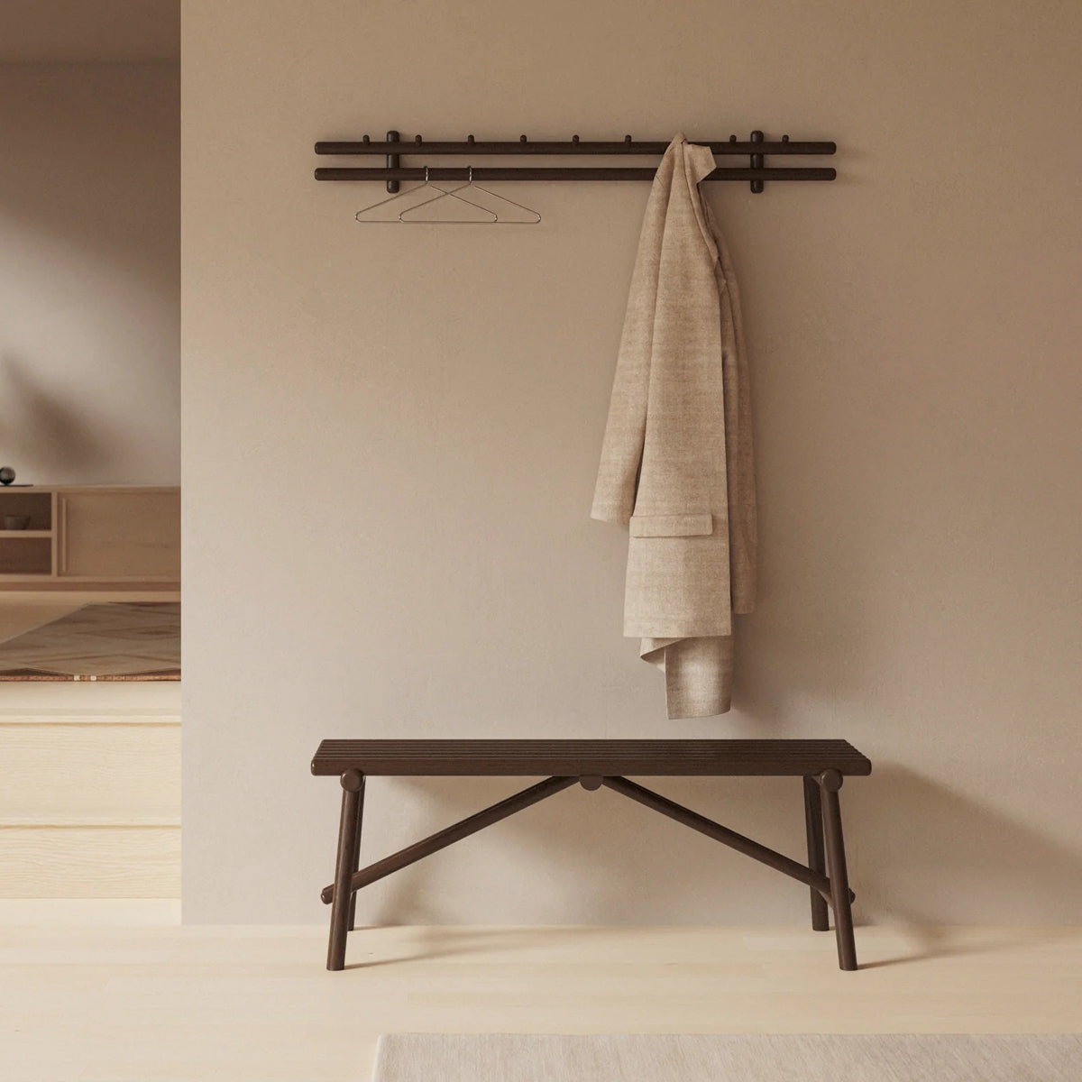 The 80 cm Sticks Coat Rack is a compact and functional addition to your home or workspace for organising and creating an inviting atmosphere in the entrance area, bedroom, hallways, or office. The Sticks coat rack is made of durable mahogany, and its rich, dark brown finish adds a natural and elegant touch to your interior. The stick-inspired design offers a striking sculptural element while providing space to organise coats, scarves, or bags. The rack blends style and practicality and is ideal for smaller areas. The 120 cm Sticks Coat Rack provides extensive storage space, making it an ideal choice for larger areas such as entrance areas, hallways, bedrooms, offices, conference rooms and restaurants. Combine the Sticks coat rack with the smaller version: Sticks Coat Rack, 80 cm, or the Sticks Coat Rack with Hat Shelf for a dynamic look and extra storage space. The rack provides plenty of space for coats, hats, or bags, keeping the room neat and inviting. Made from premium mahogany with a deep, dark brown finish, it combines durability with a sophisticated aesthetic. The stick design adds an artistic element, making it both an eye-catching and practical design piece. The Sticks Coat Rack with Hat Shelf is a versatile and stylish addition to the decor. Made from durable mahogany with a dark brown finish, it brings elegance and sophistication to spaces like the entrance, hallway, or office. The stick-inspired design offers plenty of room for coats and accessories, while the integrated hat shelf provides additional space for storing hats, boxes, or decorative items. The coat rack is both practical and aesthetic, and it is ideal for creating a tidy and organised area.