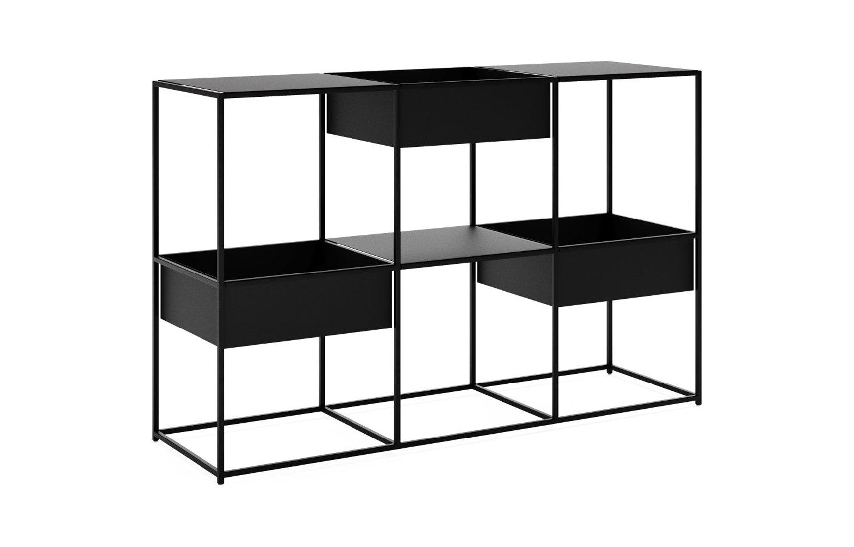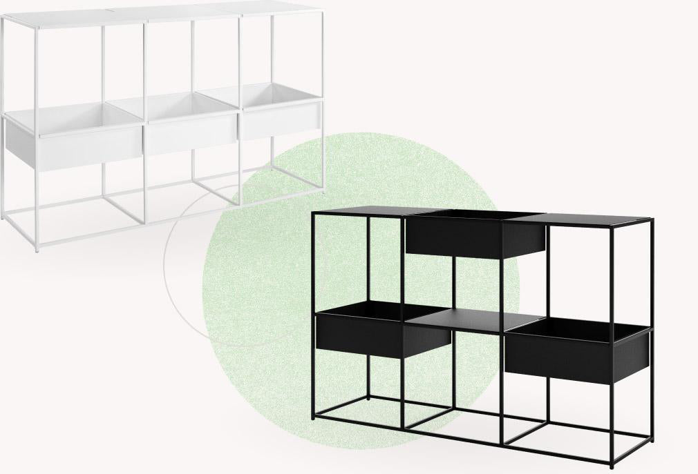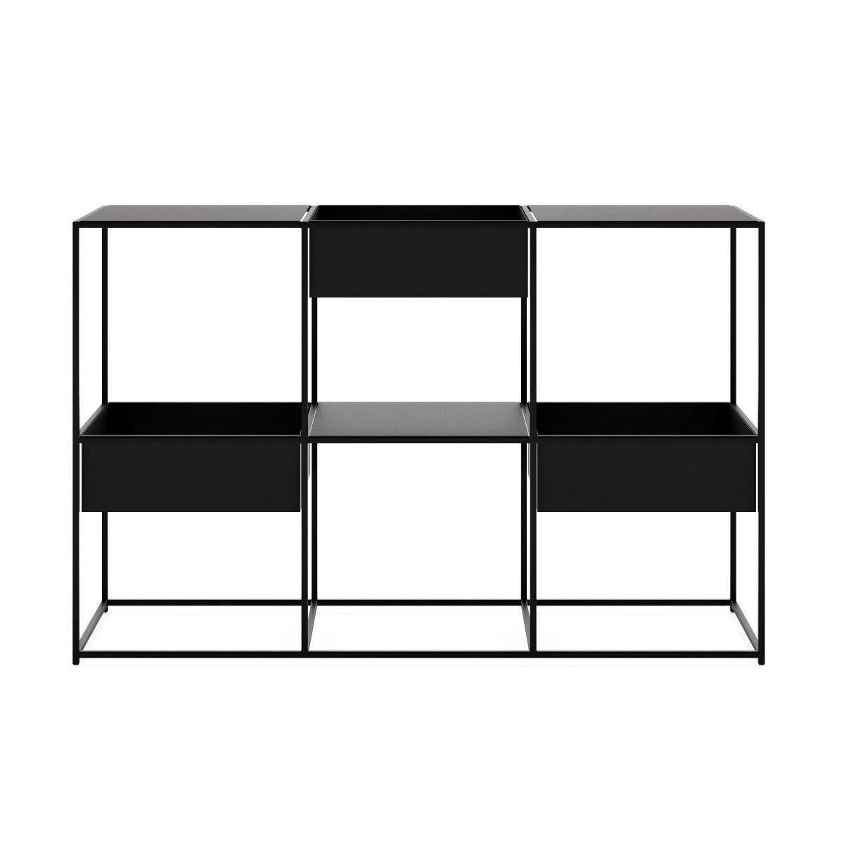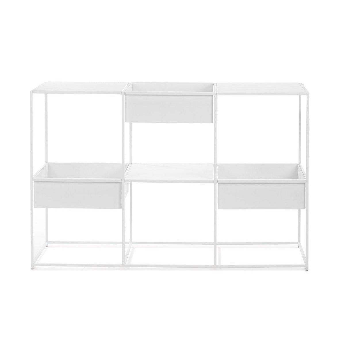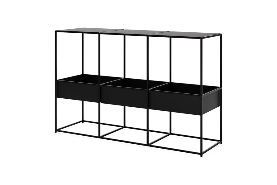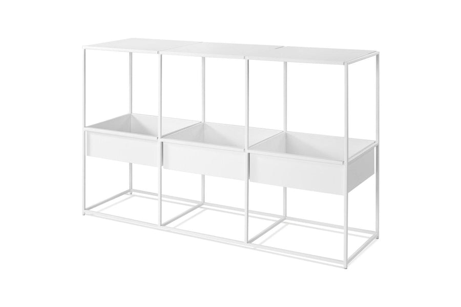 An expansion of our best-selling Urban Collection in a console configuration. Consisting of a powder coated steel frame, 3 shelves, and 3 bins, the layout can be configured as desired without the use of hardware. Additionally, the bins come with clear plastic liners, allowing them to be used as planters. Steel clips are included for securing multiple units. Available in black or white.