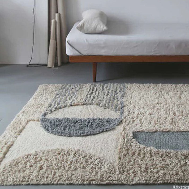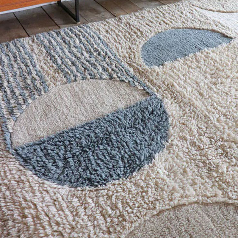 Once again, Lorena brings art from the painting to the floor, cast as a washable rug. This signature collaboration with the reputed Spanish artist Regina GimΓ©nez depicts one of her worksβ€” namely, 'Sun Rays'β€”carefully crafted in melange shades of shaggy wool and a play on pile heights for a textured finish that resembles the original painting. A cozy piece to liven up any room with an understated arty touch. As if popped out of the painting, it also has a round floor pouf to match. Each washable wool rug comes packed in a cotton tote bag that can be used for storage and includes a complimentary anti-slip underlay to fit under the rug and keep it in place.
